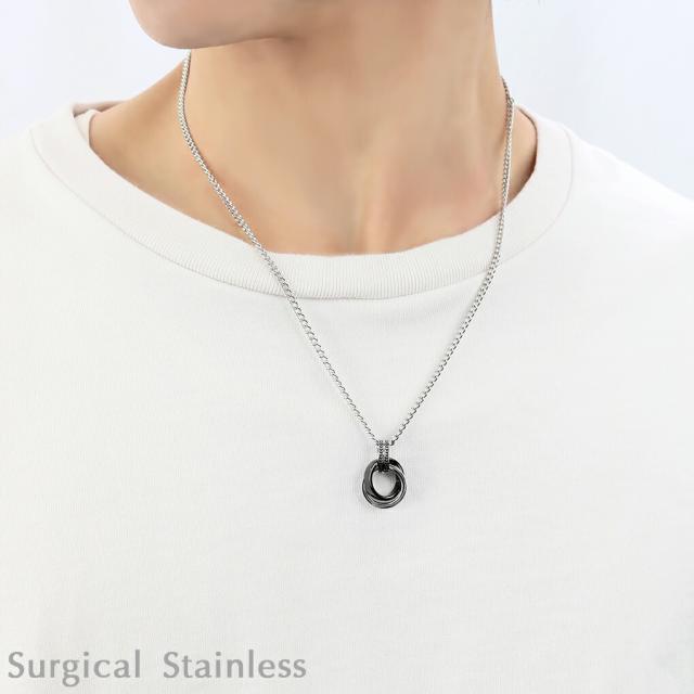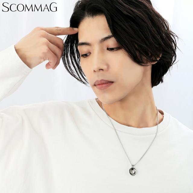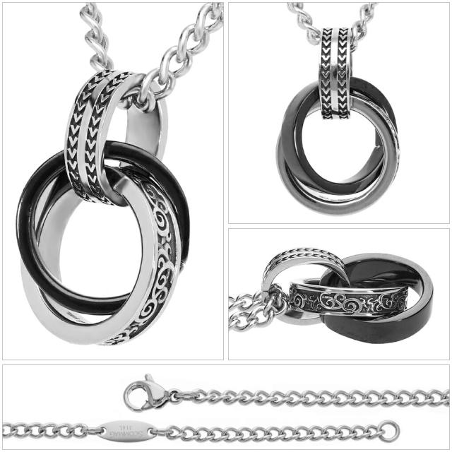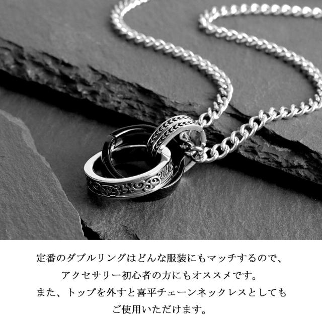 SCOMMAG ステンレス クラシック ダブル リング ネックレス (チェーン付き) ペンダント アラベスク 唐草 黒 メンズネックレス ブラック