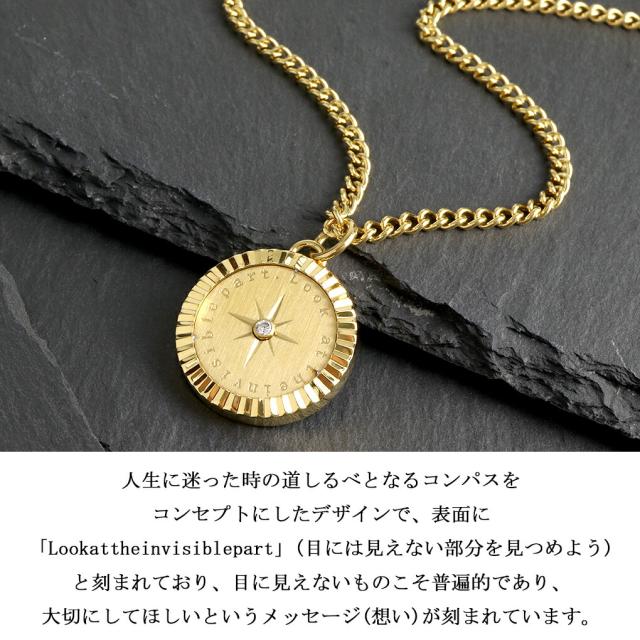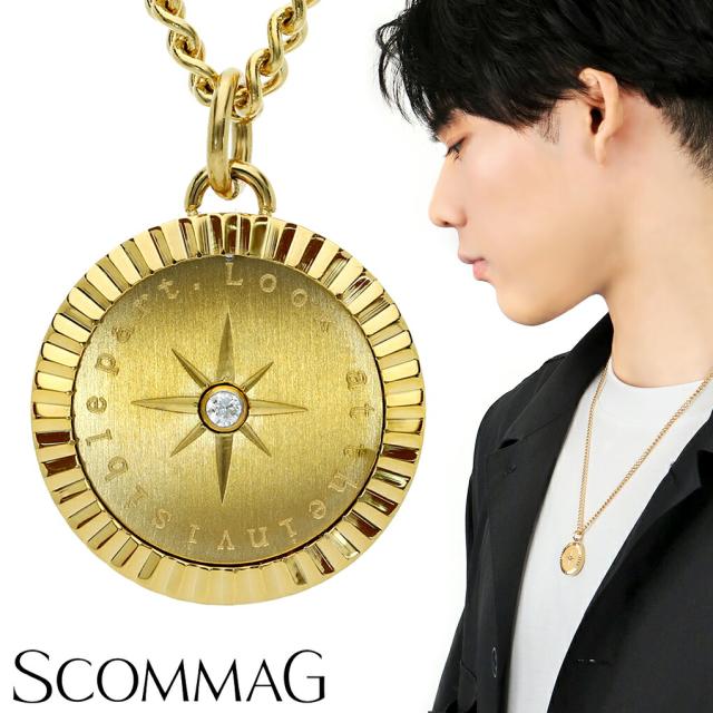 SCOMMAG ステンレス コンパス コイン ネックレス ゴールドカラー (チェーン付き) ペンダント メダル コイン メンズネックレス ジルコニア