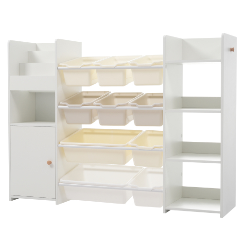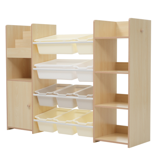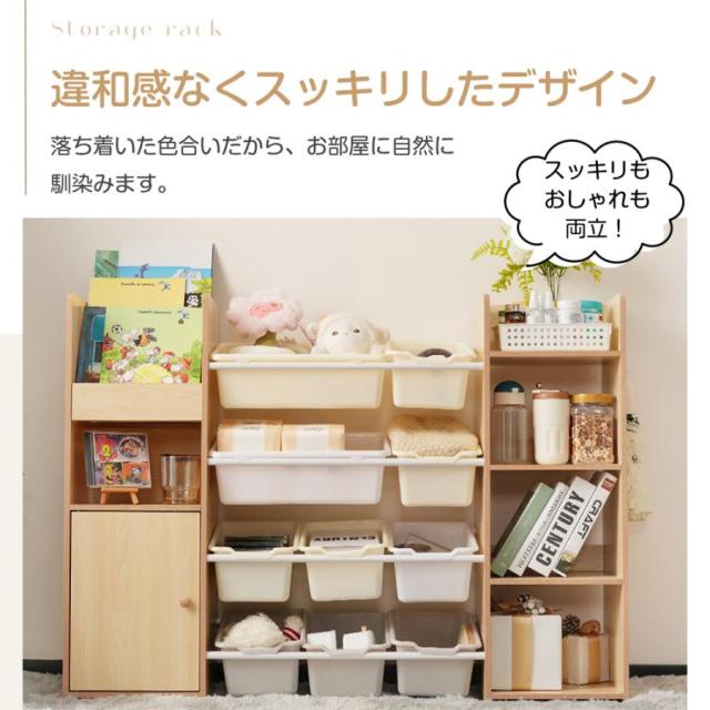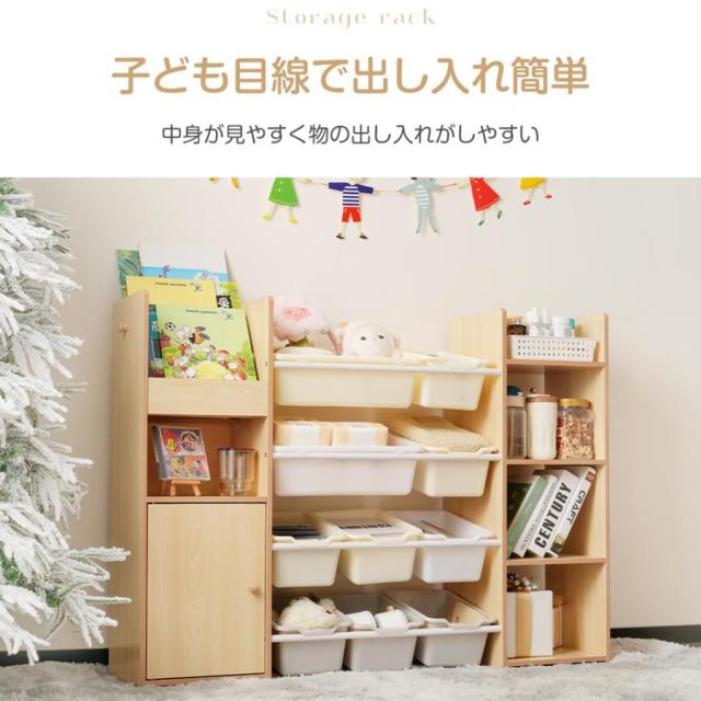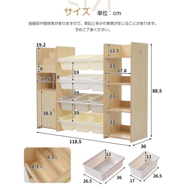 【たっぷりの収納力】収納スペースがいっぱいあり、好みによって分類収納できる!?おもちゃ収納:しまう場所が分かりやすく、自然と分類収納につながります。?洋服収納:深さ13cmのトレーなので厚手の服もしっかり入ります。?学習グッズ収納:成長と共に増えていく学習グッズ等も収納スペースに困りません。?3段ラック:お気に入りの本をスッキリした収納できます。表紙が見えるデザインから、子供の目線でも選んで手に取りやすいです。