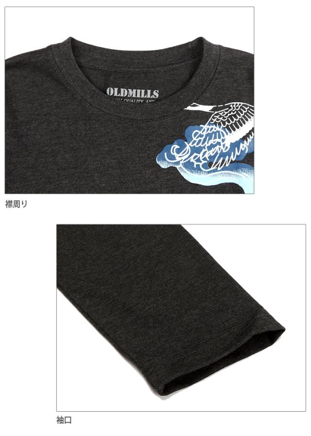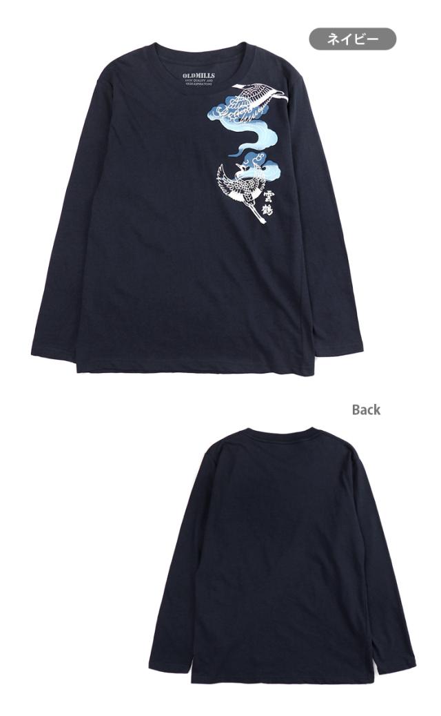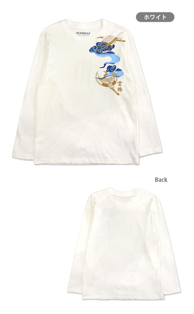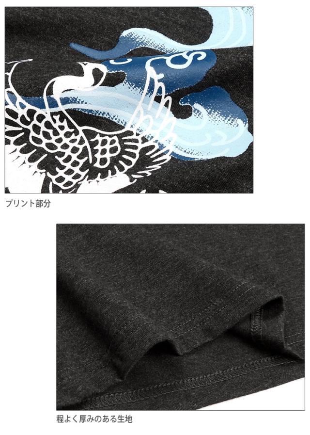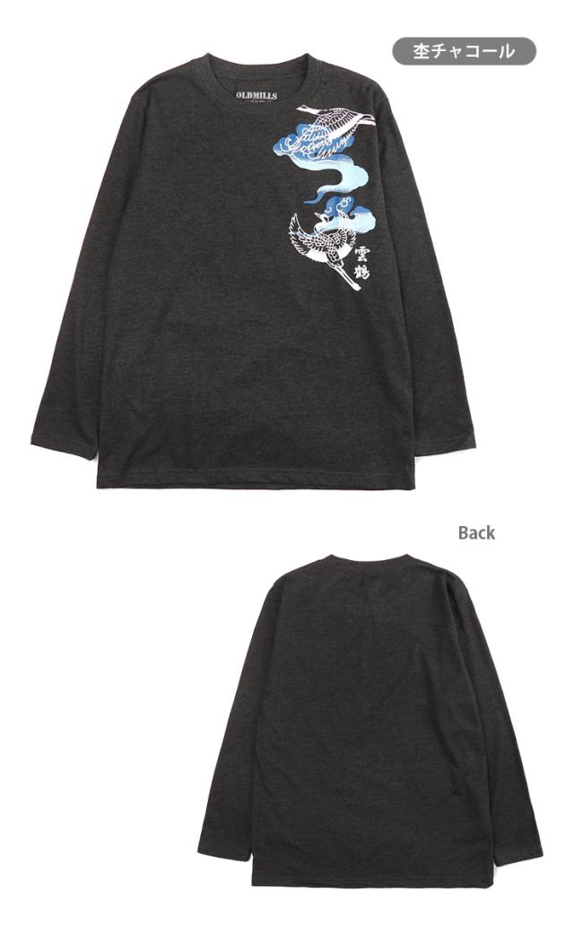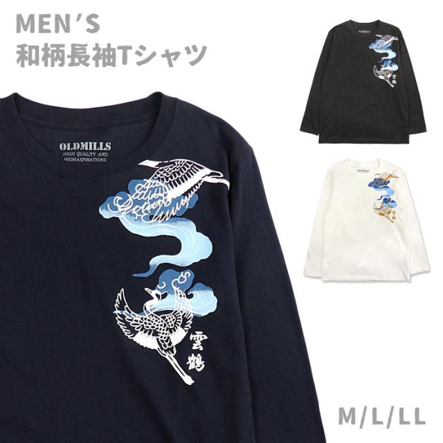 【メール便可】【大きいサイズあり】和柄 長袖 Tシャツ メンズ 春秋 M L LL 281156-25 杢チャコール ホワイト ネイビー ロンT 男性 和風 雲鶴 鶴 鳥 プリント トップス コットン 長そで Uネック 丸首 クルーネック 綿100% コットン100% 綿混 黒 グレー 白 紺 2876