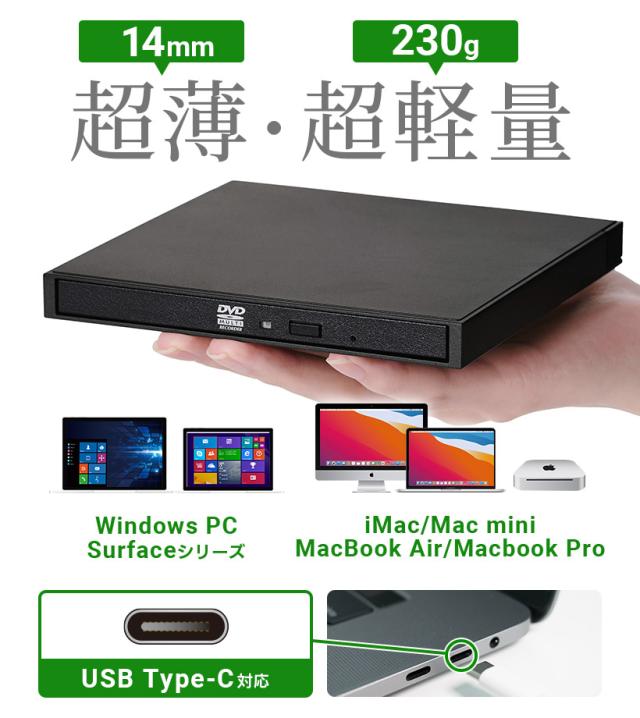 薄さ14mm、重さ230gのWindows(Mac)用USB Type-C対応ポータブルDVDドライブです。Type-C対応ドライブ非搭載パソコンで、CD再生やCD/DVDのデータ読み込み/書き込みができます。