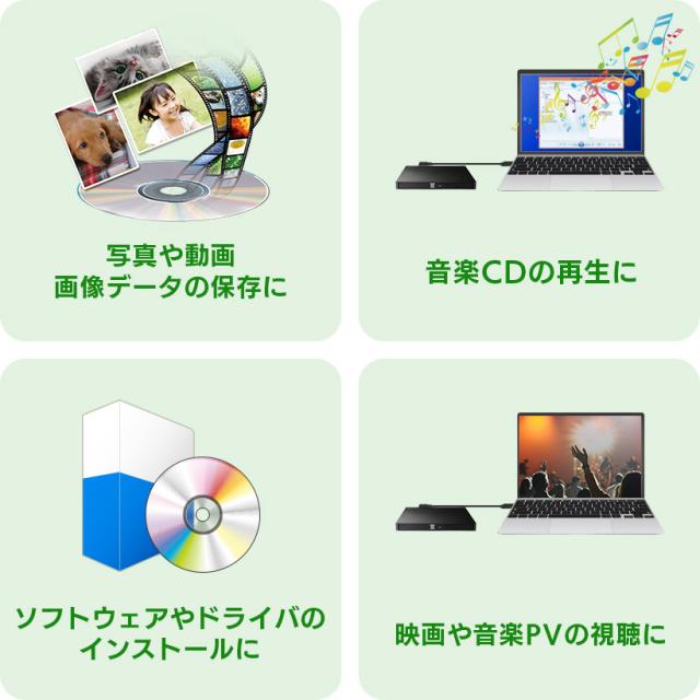 DVDやCDの読み書き、データの保存、バックアップ、音楽の再生などを行うことができます。