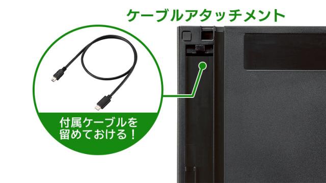底面のケーブルアタッチメントにUSBケーブルを留めておくことができるため、使わない時や持ち運び時の紛失防止に役立ちます。