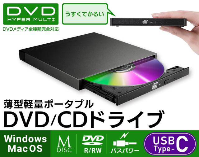 Windows Mac 対応 ポータブル DVD CD ドライブ USB Type-C ケーブル付 ソフトなし Windows11 書き込み 読み込み バスパワー 超薄型 超軽量 M-Disc対応 1年保証 LDR-LPXAW8CU2NB