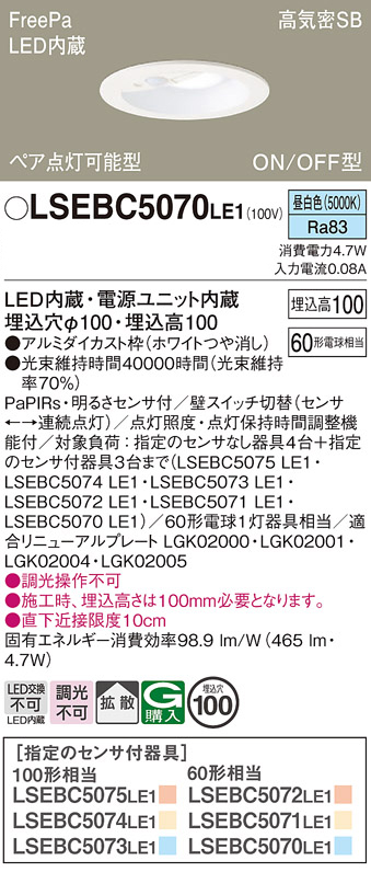 Panasonic パナソニック LSEBC5070 LE1 天井埋込型 LED(昼白色) ダウンライト 浅型10H・高気密SB形・拡散タイプ