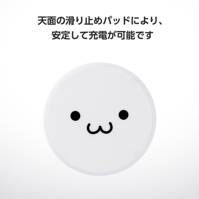 対応するAndroidやiPhoneを置くだけで充電できる、Qi規格ワイヤレス充電器です。手のひらサイズで持ち運びに便利。天面に滑り止めパッドを配置しており、スマートフォン本体への傷やバイブレーションによる滑り落ちを抑制します。USB Power Delivery対応のAC充電器を接続することで最大12Wの高速充電が利用できます。かわいいしろちゃんモデルです。