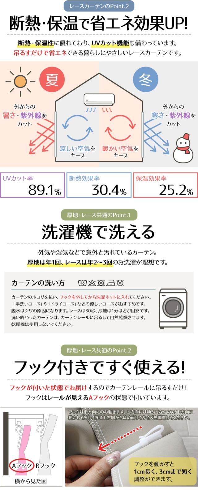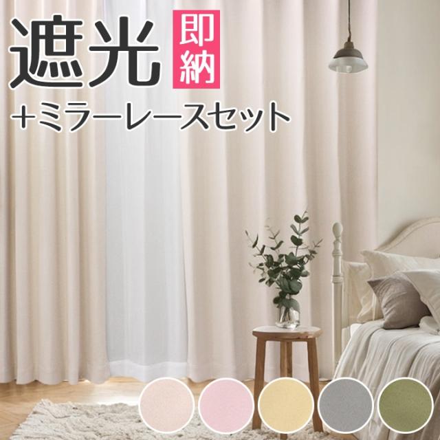 フック付きの遮光カーテン2枚+ミラーレースカーテン2枚のカーテンセットです。(150cm幅と200cm幅は遮光1枚+レース1枚の2枚セット)