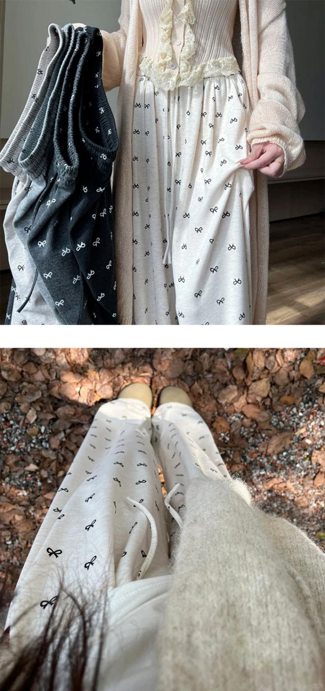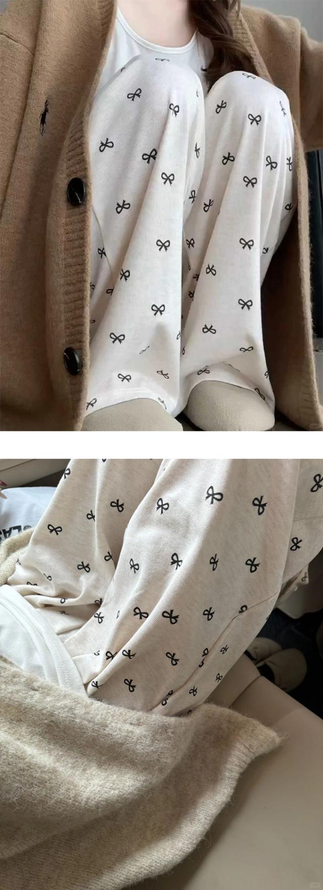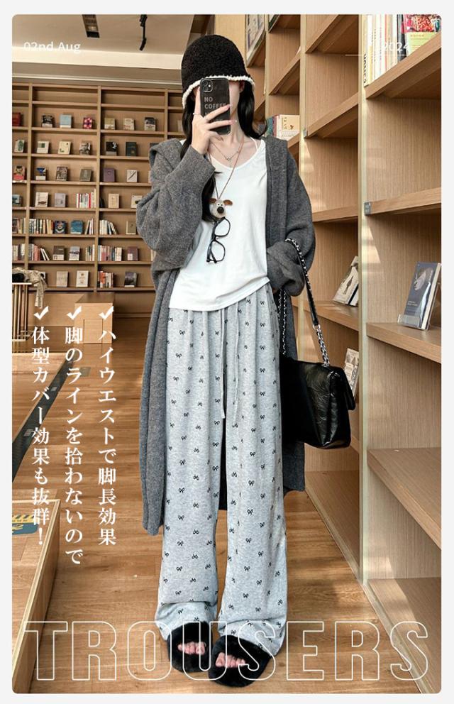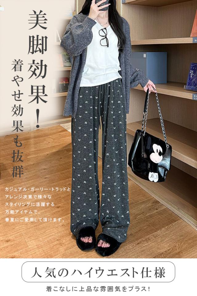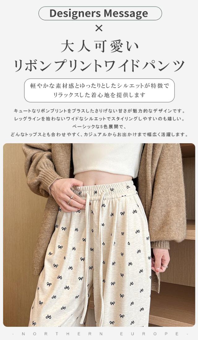 大人可愛いリボンプリントワイドパンツ
