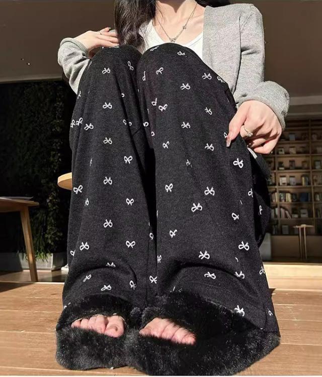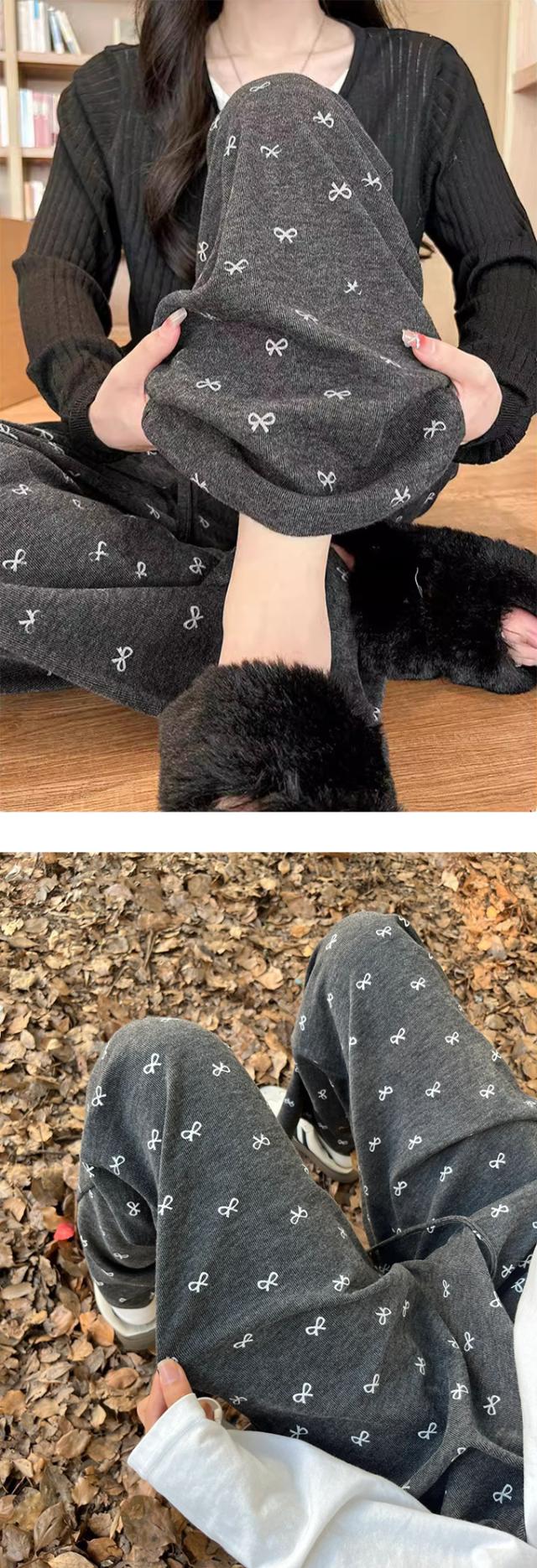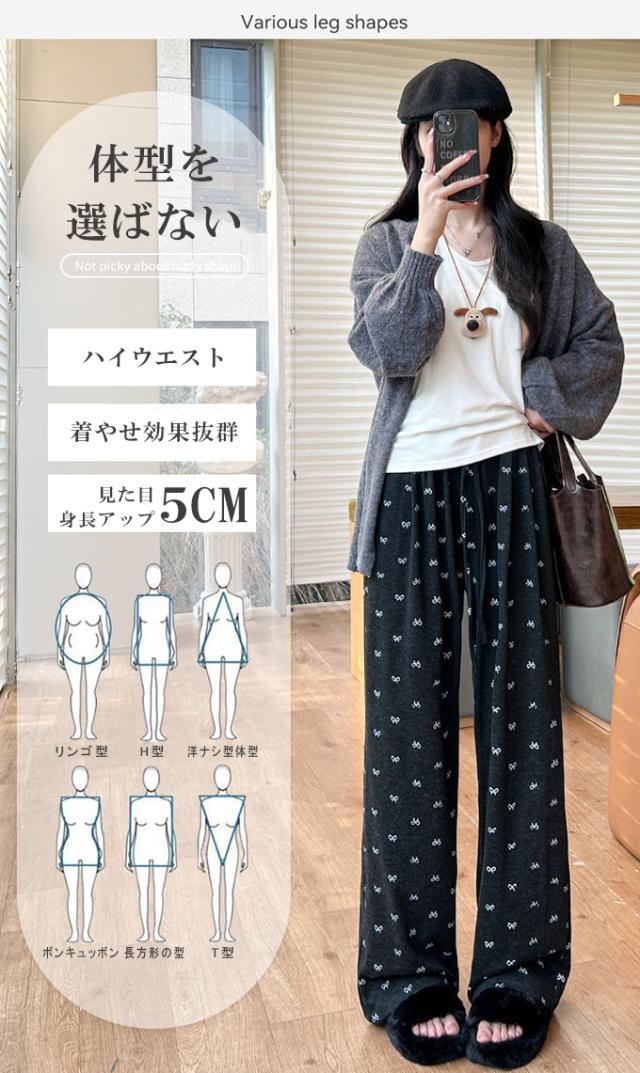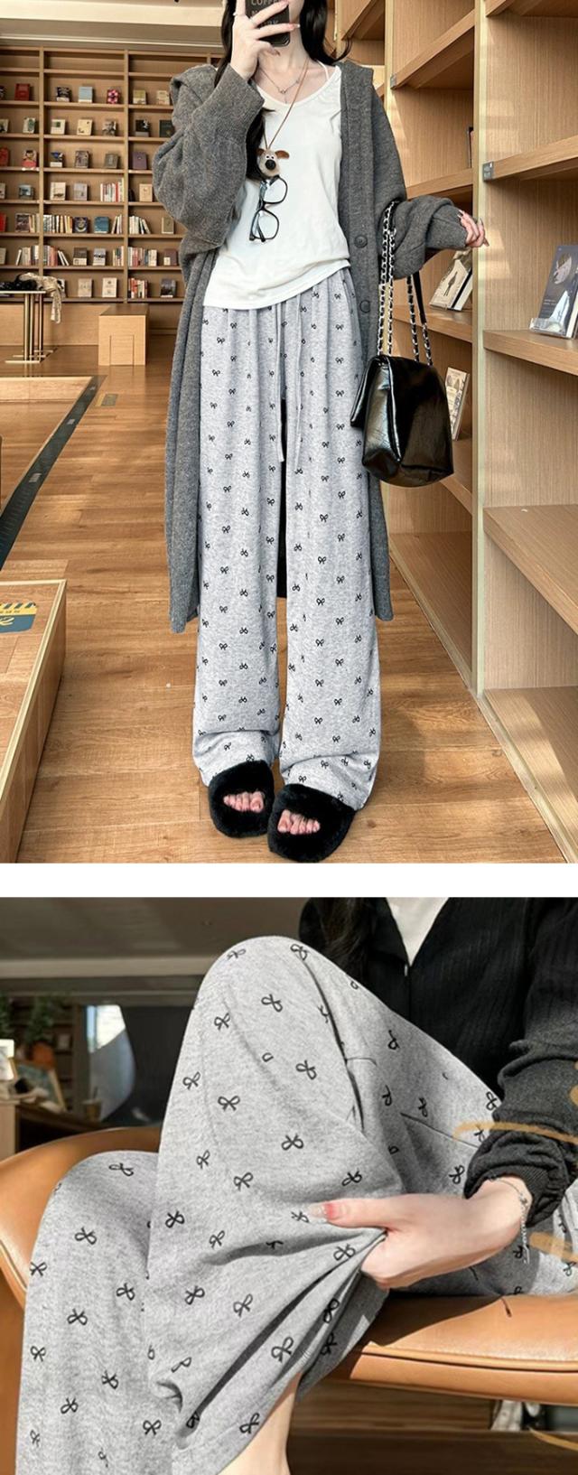 大人可愛いリボンプリントワイドパンツ