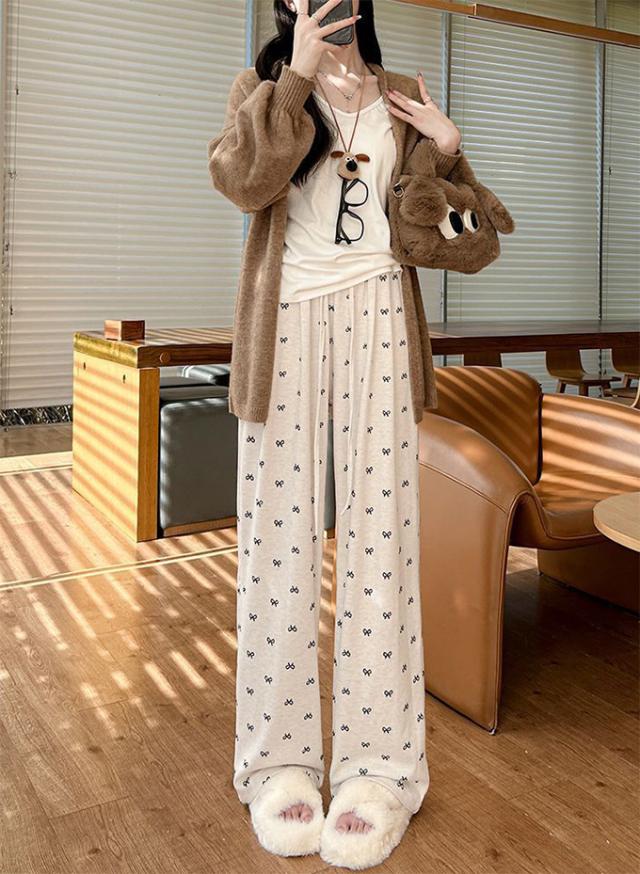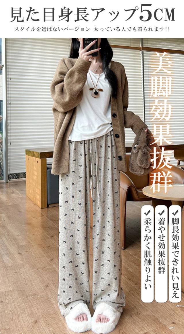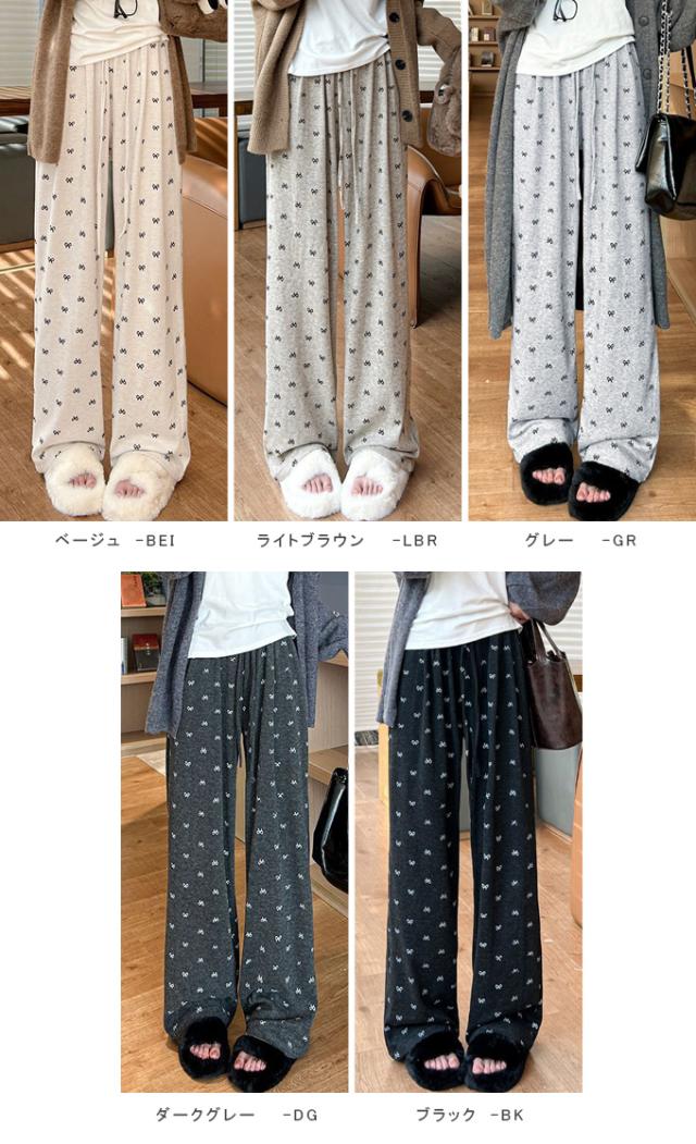 リボンワイドパンツ ズボン カジュアル ロングパンツ リボンプリント ルームウェア ロング ゆったり ガウチョパンツ