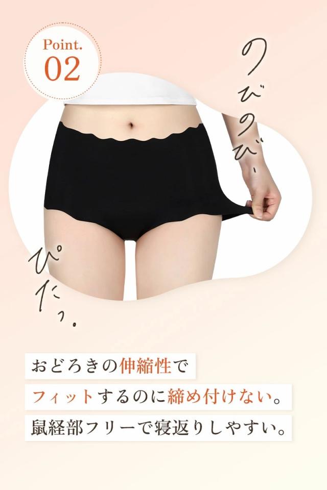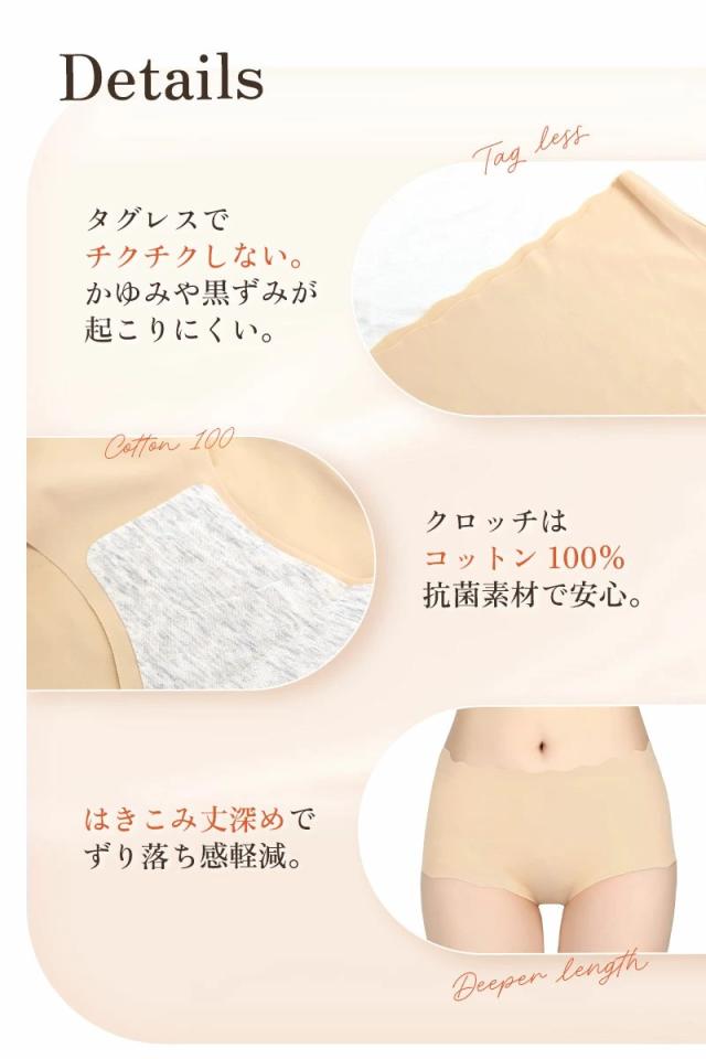 ショーツにありがちなゴムの締め付け感や、タグのチクチク感とは無縁の、まるで空気のような軽やかな着心地。縫い目がほとんどないシームレス設計により、肌に余計な刺激を与えることなく、長時間着用してもストレスを感じません。敏感肌や、産後の敏感な時期にも安心してお使いいただけます。クロッチ部分はやさしい綿素材を使用しており、通気性が良く、ムレやかぶれを防いで快適な履き心地をキープ。毎日をがんばる大人女子に、そっと寄り添ってくれるアイテムです。