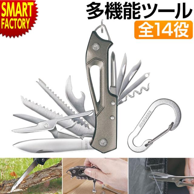携帯工具 多機能 携帯ツール 14in1 マルチプライヤー カラビナ付き 災害 防災グッズ 非常用 アウトドア キャンプ バーベキュー 登山 釣り ナイフ はさみ のこぎり うろこ取り 栓抜き プラスドライバー 送料無料