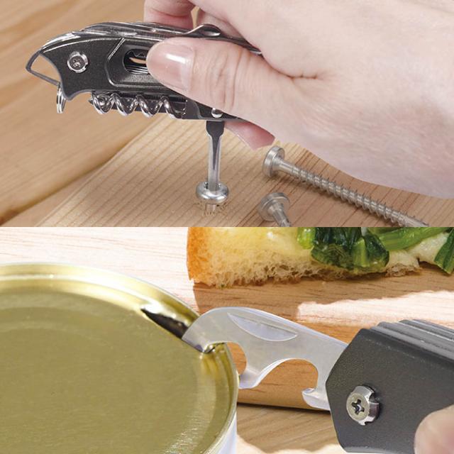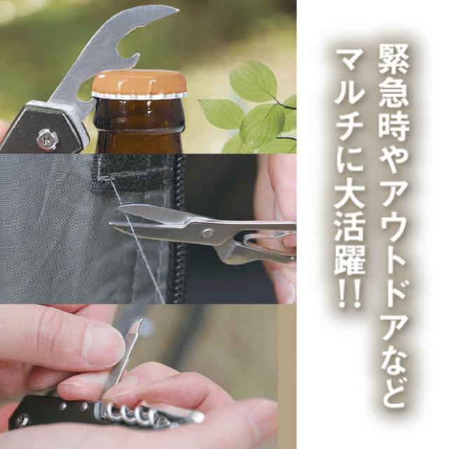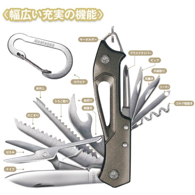 “ナイフ・はさみ・のこぎり・針外し・うろこ取り・缶切り・栓抜き・プラスドライバー・ピック・爪磨き・爪垢取り・リーマー・コルク栓抜き・ホルダー”を備えた14inマルチプライヤー。