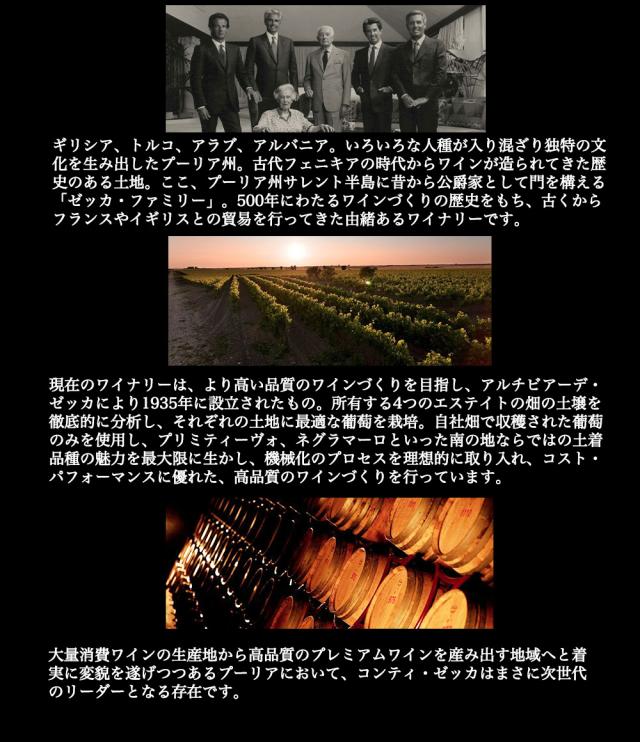 プーリア州の雄“コンティ・ゼッカ”極旨6本セット! 全て金賞の快挙!最高コスパワインの筆頭! プーリア州サレント半島に昔から侯爵家として 門を構え、ワイン造りにおいては500年以上の 歴史を持つ名門ゼッカ家のスペシャルセット! 銘醸コンティ・ゼッカの世界をお楽しみ下さい!