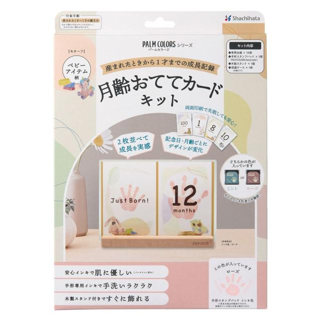 ・産まれたとき〜1才を迎えるまでの記念日や毎月の手形を、おててカード(専用台紙)に記録し、木製スタンドで飾ることができる制作キットです。