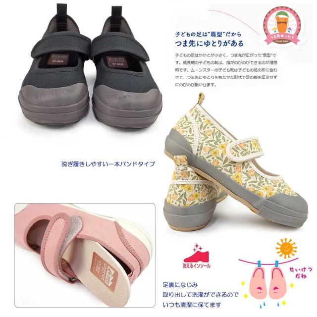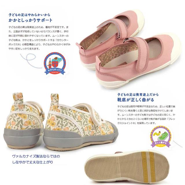 こどもの足にいいことぜんぶ」の想いから生まれた機能シューズ「ムーンスター キャロット」の「Kinarinoco」シリーズの国産上履きです。