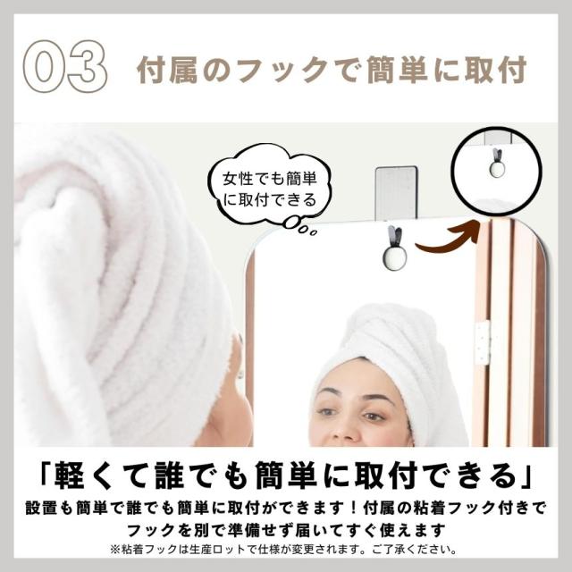 本製品は、高さ約30cm× 幅約20cmというゆったりとしたサイズで設計されています。十分な大きさがあるため、顔全体はもちろん、左右の耳や首の下までしっかりと映すことができます。遠くから鏡を覗き込む必要がなく、快適なシェービングやスキンケアが可能です。