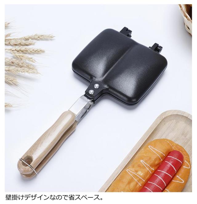 | 独立した小さなフライパン2個作りできます。 本体は熱導率の良い肉厚アルミ合金を使用しているので、 火のまわりもよく、焼きムラなくふっくらしたホットサンドが出来上がります。 挟んで焼くだけなので、忙しい朝に大活躍。 壁掛けデザインなので省スペース。 キッチンに置いておいてもインテリアの一部にもなります。 | |