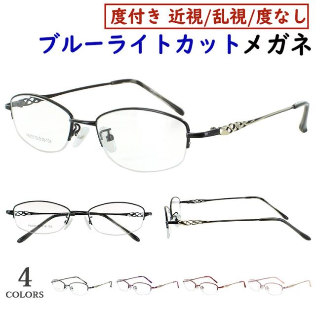 ブルーライトカット メガネ PC眼鏡 度付き 度なし レディース おしゃれ スクエア ハーフリム 軽量 ljm6020 鼻パッド付き 調整可能 ブラック パープル レッド ピンク UVカット UV400 近視 近眼 乱視 度なし だて 伊達メガネ 非球面レンズ