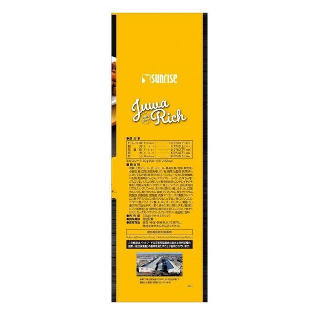 肉類(チキンミール、ビーフミール、黒毛和牛、地鶏、軟骨等)、小麦粉、糠、豆類、脱脂米糠、パン粉、糖類、油脂類、乳類(チーズ等)、でん粉類、麺、魚介類(フィッシュミール等)、食物繊維、いも類、野菜類(にんじん、ブロッコリー、トマト、かぼちゃ等)、グルコサミン(カニ由来)、サメ軟骨抽出物(コンドロイチンを含む)、増粘安定剤(グリセリン、加工デンプン)、品質保持剤(プロピレングリコール)、ミネラル類(リン酸カルシウム、炭酸カルシウム、塩化カリウム、硫酸マグネシウム、塩化ナトリウム、硫酸鉄、炭酸亜鉛、硫酸銅、炭酸マンガン、ヨウ素酸カルシウム)、保存料(ソルビン酸カリウム)、ビタミン類(コリン、C、E、ニコチン酸、パントテン酸、A、B6、B1、B2、B12、葉酸、D)、着色料(二酸化チタン、黄4、赤40、青1、黄5)、アミノ酸類(L-リジン塩酸塩)、pH調整剤、酸化防止剤(エリソルビン酸ナトリウム、ミックストコフェロール、ローズマリー抽出物)、香料