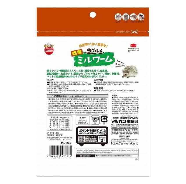 与えやすく、保存しやすい乾燥タイプのミルワーム。高タンパク、高脂肪でエネルギー補給にぴったり。便臭緩和成分配合。