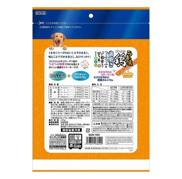 うま味シリーズのおいしさそのまま。噛むことで汚れを落とし、お口すっきり!コリコリした牛コラーゲン粒のつぶつぶ効果で汚れを落とすおいしい歯磨きジャーキーです。