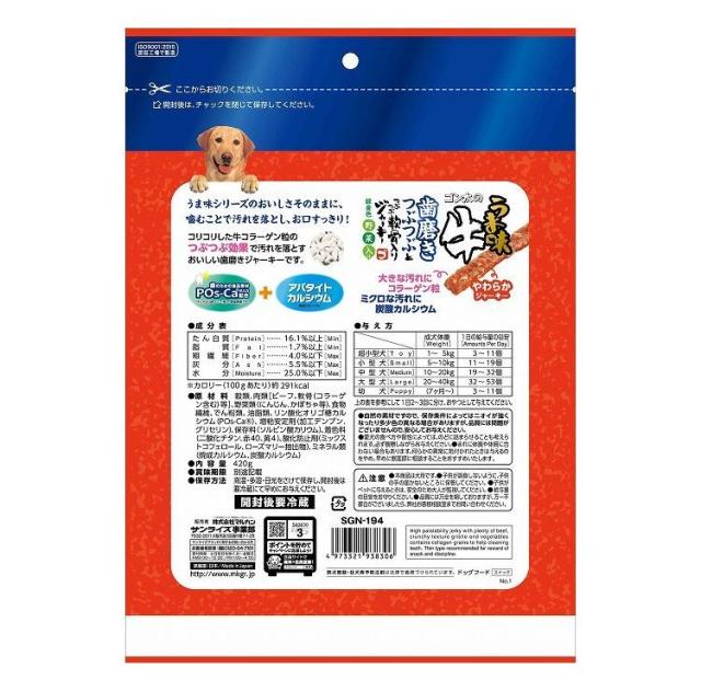 うま味シリーズのおいしさそのまま。噛むことで汚れを落とし、お口すっきり!コリコリした牛コラーゲン粒のつぶつぶ効果で汚れを落とすおいしい歯磨きジャーキーです。
