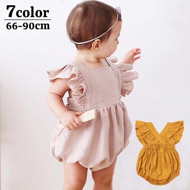 ロンパース ベビー 赤ちゃん 子供用 つなぎ ボディスーツ 肩フリル ふんわり 袖なし ノースリーブ 股下ボタン 無地 単色 ナ