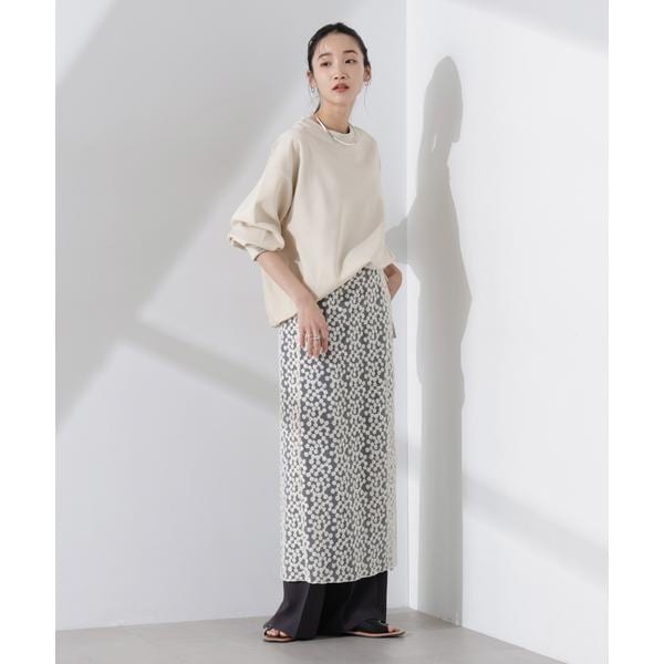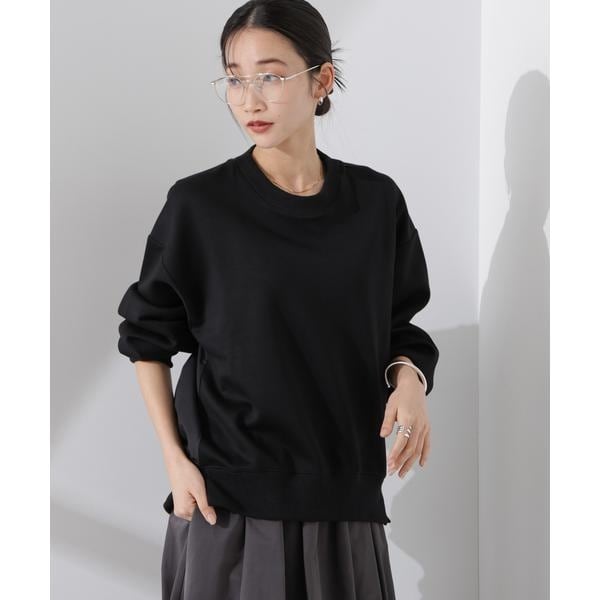 ポンチ素材と、布帛素材を、組み合わせたクルーネックトップス。前身と袖にはキレイめなポンチ素材を使用し、背中には切り替えが入った布帛素材をコンビネーションさせたデザイン。シンプルなカットソートップスを一枚できちんと感がでるデザイン性のあるひと品です。