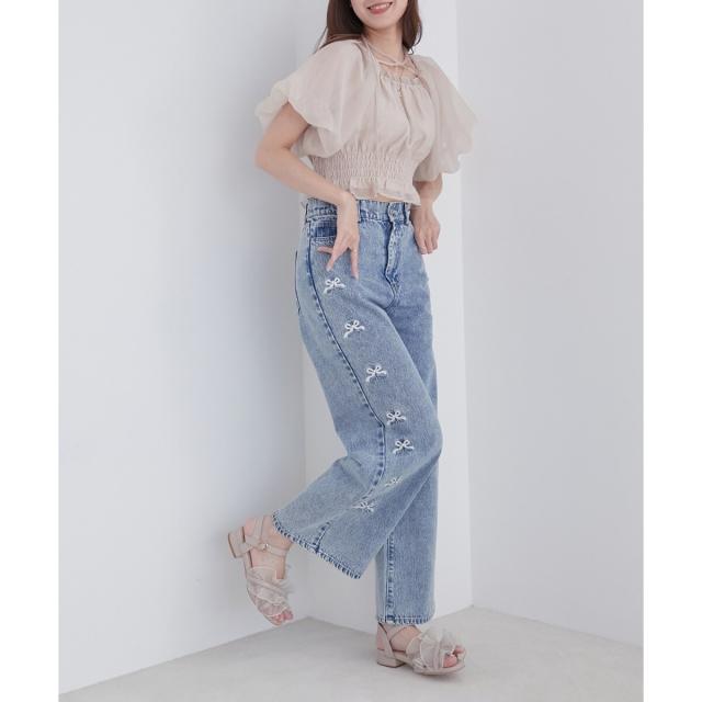 Tシャツにデニムのシンプルなコーデにも華やかさをプラス。