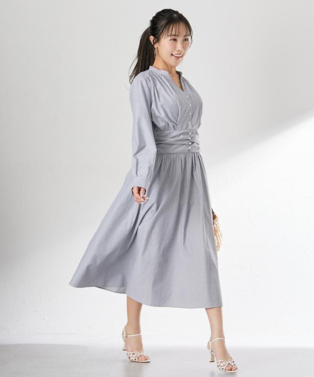 【グラマーバストさん向け】 ニッセングラマーの洋服は大きな胸をキレイに魅せることにこだわった、グラマーバストさん専用設計。 「胸が入る」だけでなく、胸が大きい女性のスタイルが美しく見えるようにこだわりました。 シリーズ商品は「大きな胸をキレイに魅せる服」で検索して下さい。 春はすぐそこ!着やせを叶えるストライプワンピース ■デザイン ・グラマーバスト専用設計独自の設計で高さをしっかり出しているので、メリハリのある美しいシルエットを演出・着痩せが叶うウエストマークでくびれを演出。ウエスト後ろゴム仕様で、柔軟にフィット。フレアスカートで美しいシルエットに。・デコルテが美しいVライングラマーバストがすっきり見えるVライン。かがんでも見えにくく、抜け感があります。・こだわりのボタン間隔ボタンの間隔を狭く設定し、横から見たときにチラ見えしにくい仕様にしました・後ろシャーリングシャーリングゴム仕様で、くびれを演出。着脱もらくちん。・深めのポケット付で便利スマホがすっぽり入る深めポケットで安心・上品ストライプ涼しげで上品な細めのストライプです。縦ラインで細見え効果も!