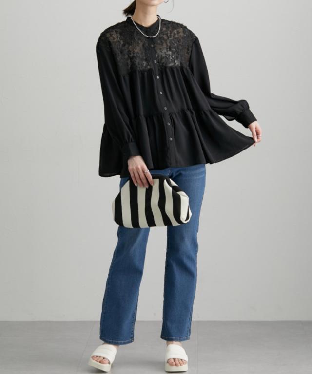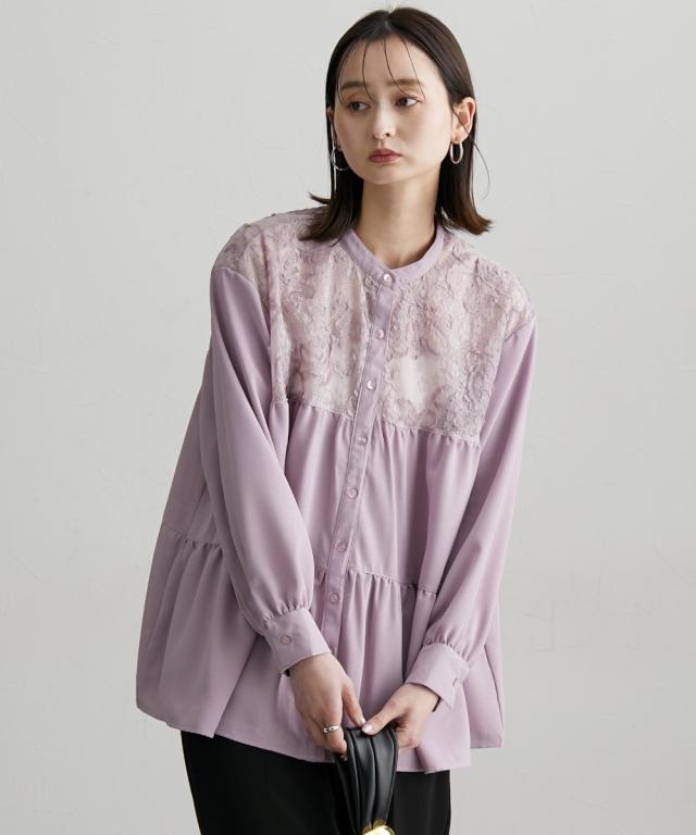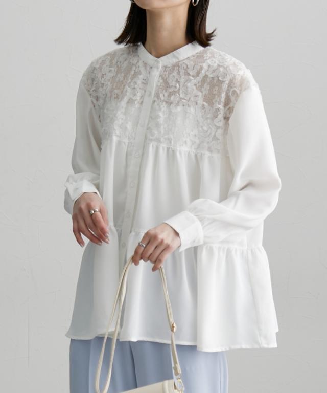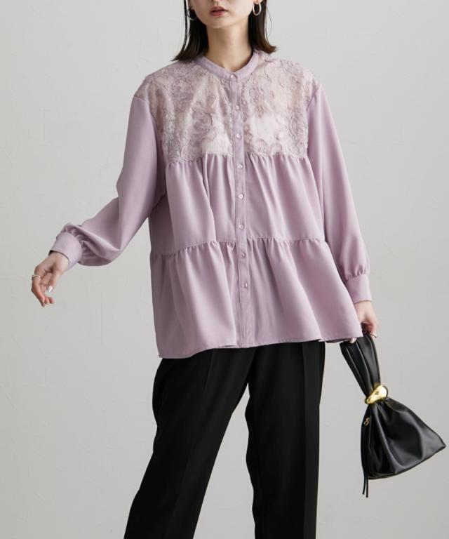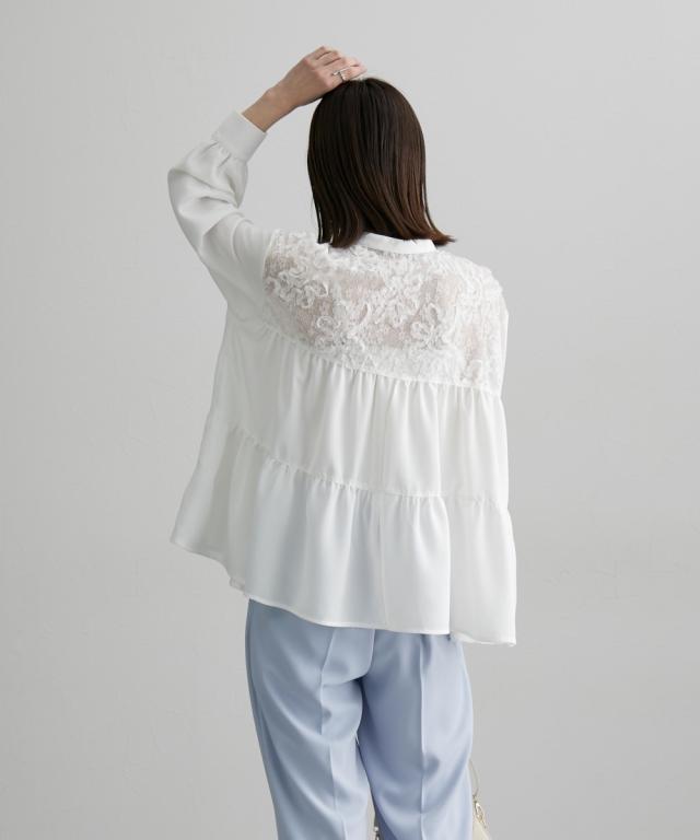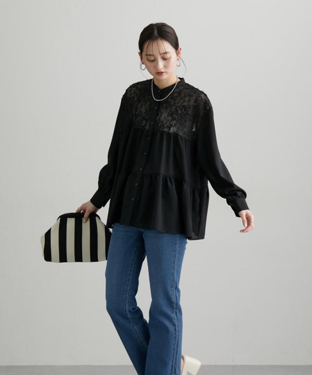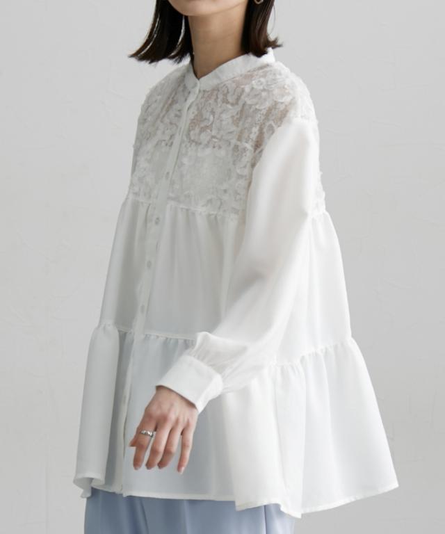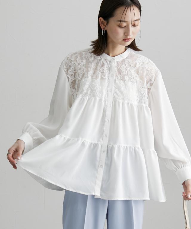 透け感のあるレースがポイント 切替ティアードブラウス ■デザイン お顔周りのレースの透け感がポイントになるブラウス デザインはAラインなシルエットにフレアなティアードデザインで、腰回りの体型カバーにも ・前開きタイプのブラウスなので、着脱もラクチン ・ちょっとしたお出かけやオケージョンのシーンでも活躍すること間違いなしなおすすめのブラウスです ■素材 薄手の布帛素材を使用 ■おすすめのスタイリング オフィススタイルやオケージョンスタイルまで対応 な、万能ブラウス Aラインでティアードなデザインなので、ボトムとの着合わせがおすすめです 動いた時のシルエットもキレイに見せてくれますよ ーーー明日ちょっと褒められる服ーーー 大人トレンドを意識したこだわりのアイテムと着こなしでアナタの毎日に輝きを。 ただシンプルできれいなだけじゃ物足りない。 カジュアルすぎず、スタイリッシュで大人の品性を感じる着こなしに。 そんな、こなれたオシャレを楽しむ女性に寄り添う、 新鮮なリアルクローズをご提案します。