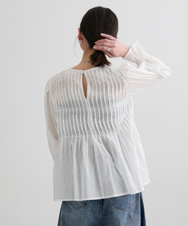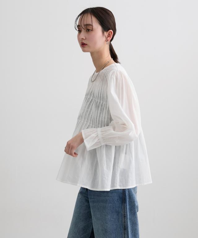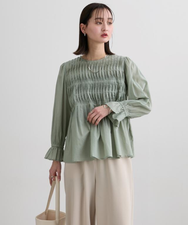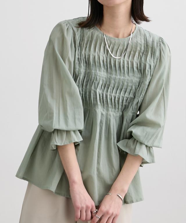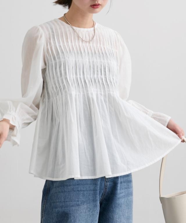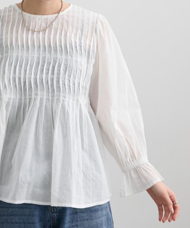 インド綿使用 ボリュームありのピンタックブラウス ■デザイン ・涼し気な印象の透け感が特徴のインド綿素材のブラウス ・フロント部分のピンタックデザインが、豪華に入っており、贅沢で価値観のあるブラウスです。 ・裾に向かってフレアなデザインなので、お腹周り等の気になる部分の体型カバー効果あり ■素材 柔らかく透け感のあるインド綿素材です ■おすすめのスタイリング キレイめのコーデから、デニム合わせ等のカジュアルなコーデまで幅広く対応可能なブラウス! 着合わせのボトムはパンツスタイルがすっきり見せてくれるので、おすすめです! 袖先もゴム入でギャザーありのフレアなデザインになっているので、プッシュアップしての着用スタイルもかわいくておすすめです ーーー明日ちょっと褒められる服ーーー 大人トレンドを意識したこだわりのアイテムと着こなしでアナタの毎日に輝きを。 ただシンプルできれいなだけじゃ物足りない。 カジュアルすぎず、スタイリッシュで大人の品性を感じる着こなしに。 そんな、こなれたオシャレを楽しむ女性に寄り添う、 新鮮なリアルクローズをご提案します。