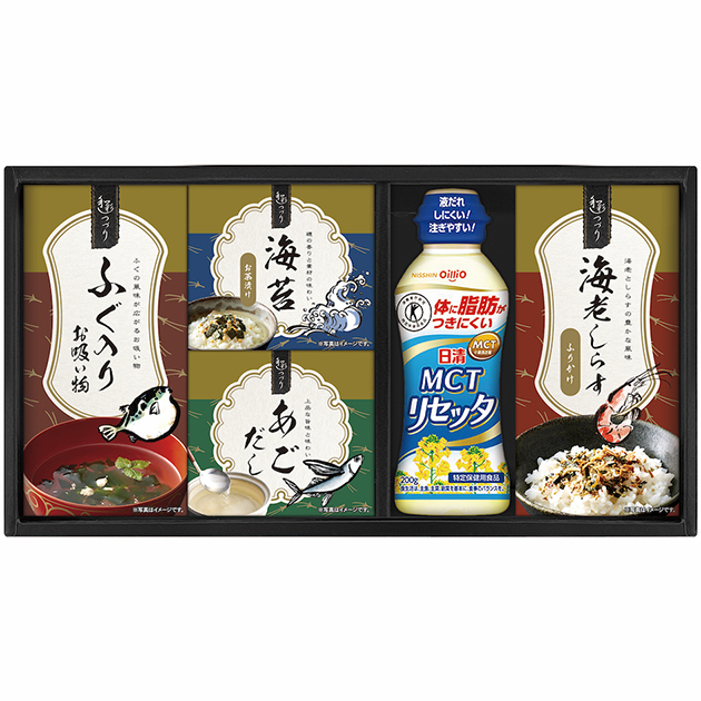 ●日清MCTリセッタ200g・海老しらすふりかけ(3g×3)・海苔茶漬け(5.5g×2)・あごだし(6g×2)・ふぐ入りお吸い物(3.2g×3)