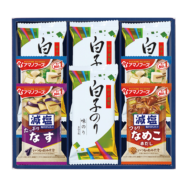 ●白子のり味のり(8切5枚入)×4、減塩いつものおみそ汁(なす)9g×1、減塩いつものおみそ汁(とうふ)10.3g×2、減塩いつものおみそ汁(なめこ)8g×1
