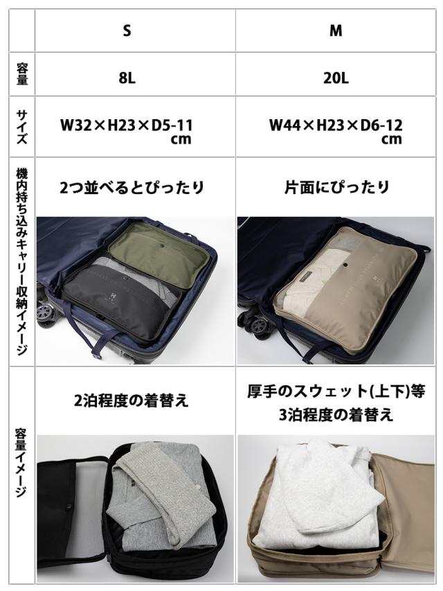 機内持ち込みのキャリーバッグに収まるサイズになっています。約20Lで冬場の衣類など嵩張る時にも安心。未使用時にはクローゼットの整理・避難用の備えなどに活用できます。