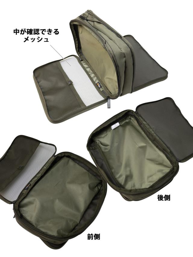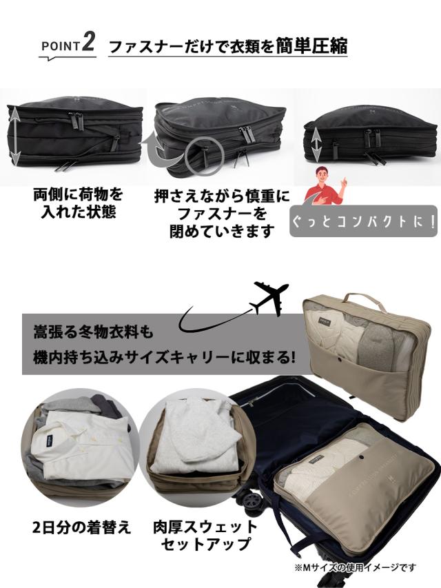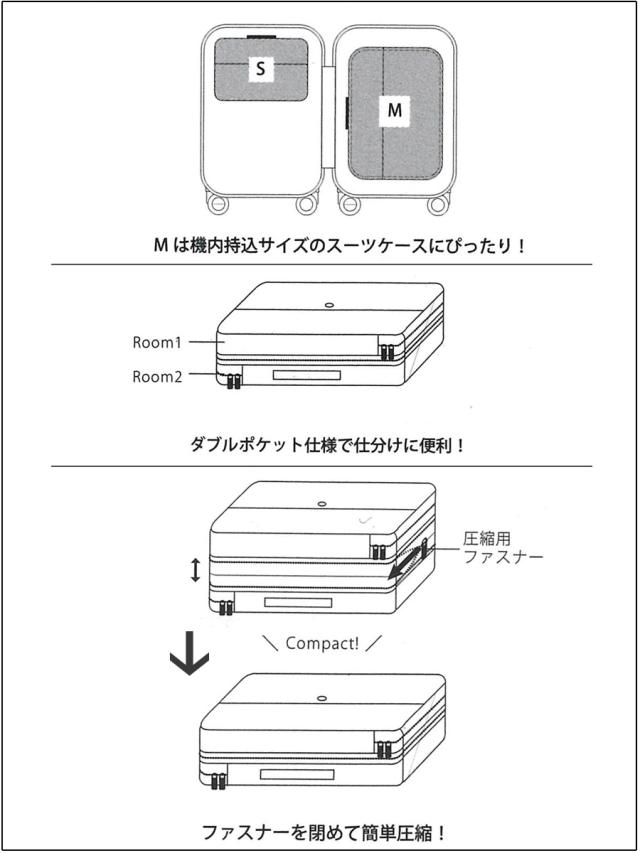 ファスナーで圧縮することができる2ルーム式の収納ポーチです。2室に分かれているので、肌着・衣類、洗濯前・着用後など仕分けができて便利です。収納した後中央のファスナーを閉めていくとマチが圧縮されコンパクトに持ち歩けます。