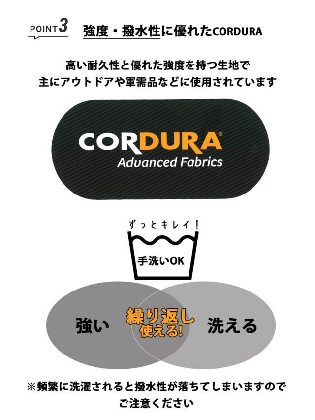 強度・撥水性に優れたコーデュラ素材を使用しています。汚れが気になったときには手洗いが可能です。(撥水性が落ちていきますので洗いすぎにはご注意ください)