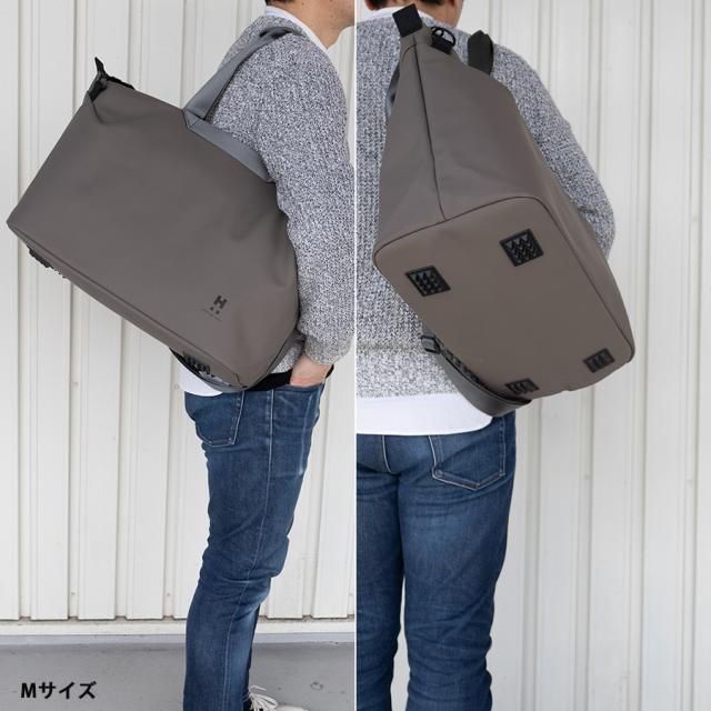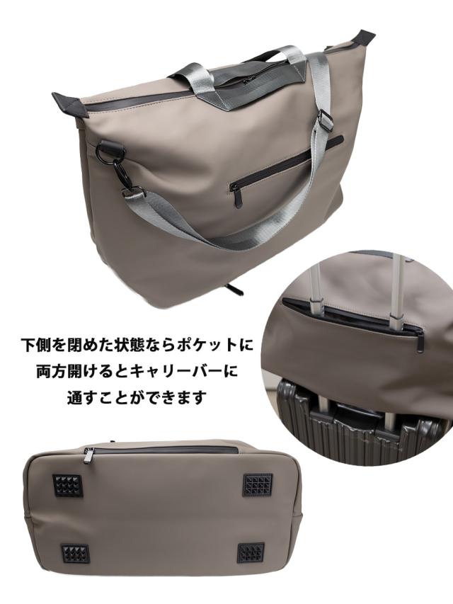 約43L(2〜3泊程度)のサイズで背面の2段のファスナーを両方開けるとキャリーバーに通して使用することができます。未使用時は下側のファスナーを閉めればポケットとしてお使いいただけます。2種類のハンドルと取り外しできるショルダーベルト付き。