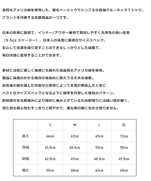 良質なアメリカ綿を使用した、最もベーシックでシンプルな長袖クルーネックTシャツ。 ブランドを代表する定番商品の一つです。 日本の気候に最適で、インナー/アウター兼用で着回しやすく汎用性の高い生地(5.5oz ジャージー)、日本人の体型に最適なサイズスペック、安心して洗濯を繰り返すことのできるしっかりとした縫製で、毎日快適に愛用することができます。 素材には肌に優しく強度にも優れた高品質のアメリカ綿を使用。 製品に負担のかかる独自の後染めに耐えうる丈夫な縫製。 染色後の最も縮んだ状態から着用によって生地が馴染んだときにベストなサイズスペックとなるように縮率を計算した独自のパターン。 胴体部分を丸胴編みにより筒状に編み上げているため胴周りには縫い目が無く、見た目も着心地もすっきりと軽やかで、重ね着の際にもかさ張りません。 | ||||||