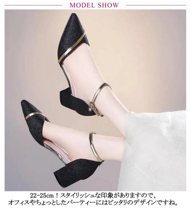 パンプス キラキラ ヒール5cm 太いヒール ローヒール チャンキーヒール アーモンドトゥ ストラップ アンクルストラップ レディース 上品 シルバー ゴールド ブラック 結婚式 ピアノ 発表会 綺麗め パーティー シューズ 靴 イベント 謝恩会 演奏会 22〜25cm
