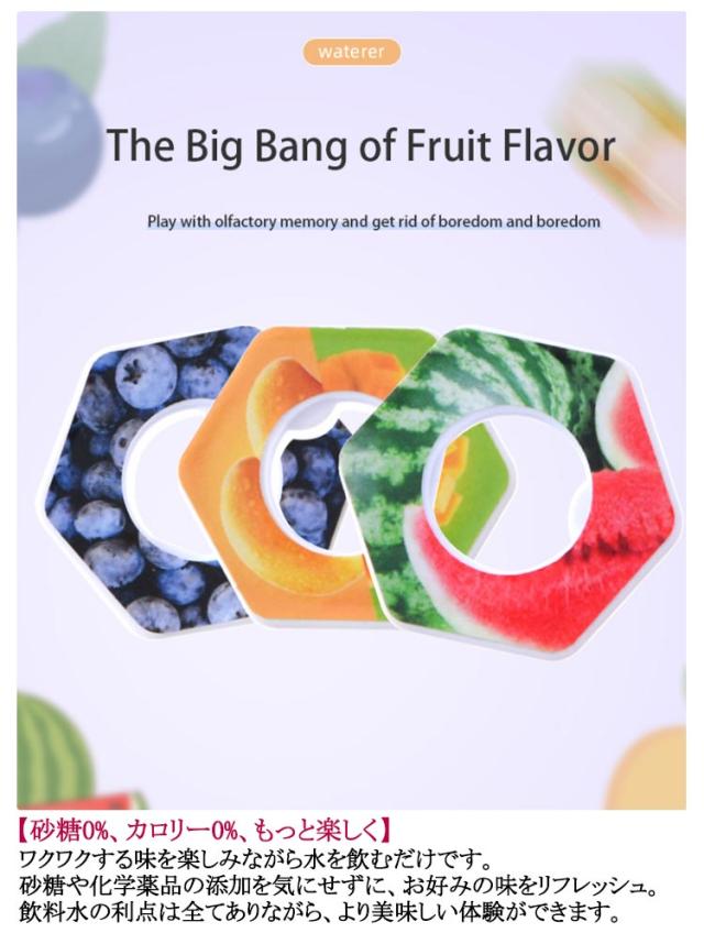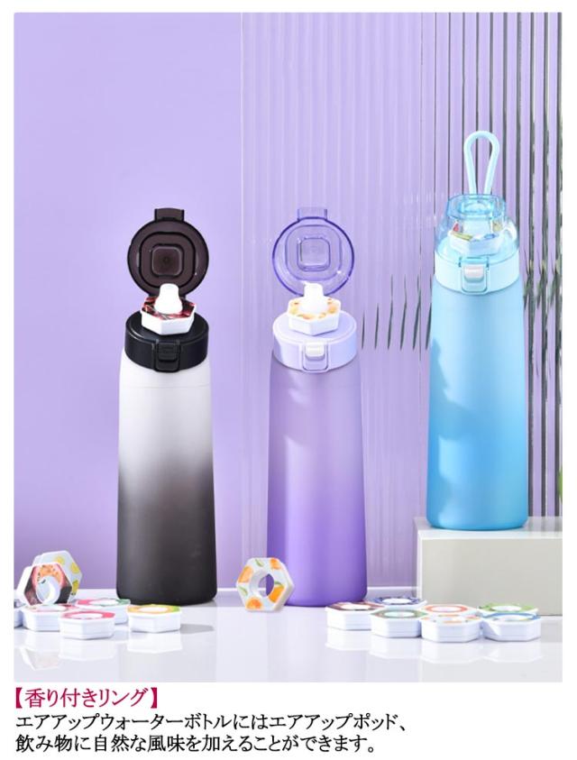 | 【ワンタッチで蓋が開く】ボタンを押すだけで瞬時に蓋が開き、飲み物を楽しむことができます。 【BPAフリー】ベビーの哺乳瓶に用いられる安全安心のTritan素材、BPAフリー。 【持ち手付き】持ち手付きで持ち運びはとても便利です。 【味のある水を飲んでいるように】味覚はすべて舌の味蕾に反映されていると考えていますが、実際には、舌は味覚体験の一部しか関与していません。嗅覚を使って味の源を反映することができます。この水グラスで水を飲んでも味はありませんが、嗅覚を使ってフレグランスリングがもたらす味を体験できるので、味のある水を飲んでいるように感じます。 【砂糖0%、カロリー0%、もっと楽しく】ワクワクする味を楽しみながら水を飲むだけです。 砂糖や化学薬品の添加を気にせずに、お好みの味をリフレッシュ。 飲料水の利点は全てありながら、より美味しい体験ができます。 【香り付きリング】エアアップウォーターボトルにはエアアップポッド、飲み物に自然な風味を加えることができます。 【漏れ防止&防塵】この水筒の蓋には、透明カバーと内部のシリコン製シールリングを使用し、防塵防滴に配慮しています。また、水筒がひっくり返っても漏れない安全ロック設計です。 このペットボトルをバックパック、自転車、旅行バッグに接続すると便利です。 旅行、ハイキング、ジム、すべての屋内外活動に最適です。 | |