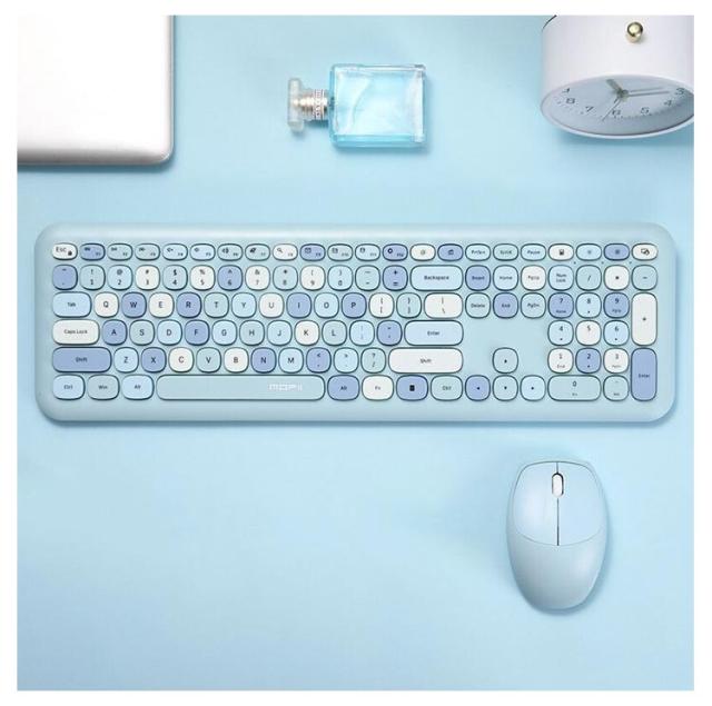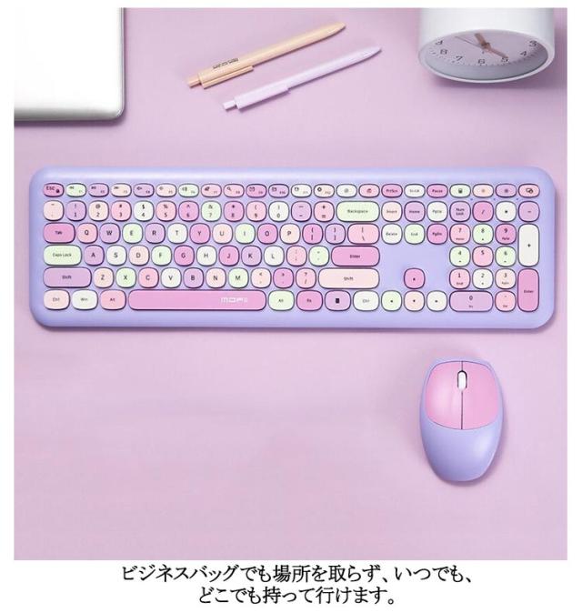 | カラフルな配色がかわいいキーボード&マウスセット。 ワイヤレスキーボードだけではなく、ワイヤレスマウスも付属される2点セットで経済的です。 どのボタンでもバランスがよく、快適で、静かなクリックができます。 Windows、Android、macOS、iOSなど様々な機器で使用できます。基本的にBluetooth搭載しているiPad、スマホ、PC等、各種の端末に対応します。 キーボードはパソコンやスマートフォンなど、Bluetoothを内蔵した機器とレシーバーなしで接続できます。 マウスは2.4GHzワイヤレステクノロジーを採用し、ドライバーのダウンロードや設定が不要で、PCにUSBレシバーを接続すればすぐに使えます。 最大10Mまで通信できるので、距離や位置に気にせず自由自在に移動できます。 ビジネスバッグでも場所を取らず、いつでも、どこでも持って行けます。 | |