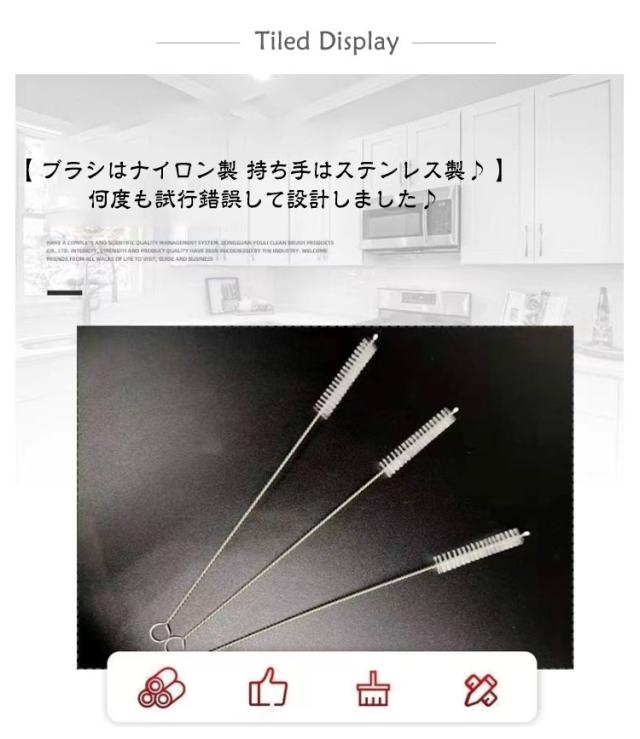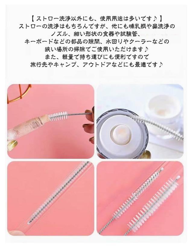 | 【40本セット】 長さ17.5cm 極細タイプ 360度キャッチ ストローブラシ 【 ブラシはナイロン製 持ち手はステンレス製♪ 】 ・何度も試行錯誤して設計しました♪ ストローブラシは、ブラシ部分にナイロン素材を採用し、 持ち手には高品質なステンレス素材を採用しておりますのでサビなどに強く、長く、繰り返し使えるモデルです♪ また、素材自体は人体に害を与えず環境にも優しいアイテムとなっております♪ ・特徴&機能性 抜群のアイテム♪ 本製品の特徴として、持ち手部分が長いことにあります。 持ち手部分が長いことで、ロングタイプのストローや手が届きにくい箇所まで綺麗に洗う事ができます。 持ち手部分は針金のように自在に曲げることができますので、曲がったストローでも洗浄することができます。 【 ストロー洗浄以外にも、使用用途は多いです♪ 】 ストローの洗浄はもちろんですが、他にも哺乳瓶や鼻洗浄のノズル、細い形状の食器や試験管、 キーボードなどの部品の隙間、水回りやクーラーなどの狭い場所の掃除でご使用いただけます♪ また、軽量で持ち運びにも便利ですので旅行先やキャンプ、アウトドアなどにも最適です♪ 【 極細タイプで洗浄に適している 】 製品のストローブラシは、極細タイプを採用しておりますので、 ストローやチューブ、注ぎ口などの洗浄しにくいに箇所でも手軽に洗うことができます。 【 内部にぴったりと沿います 】 ナイロン製のブラシを採用することで、ストローの穴に入れた際、 ぴったりと内面に合うので細かい部分までしっかり洗浄することができます。 【 ストローの洗浄に適している 】 先端部分にはABS樹脂を採用したキャップが付いておりますので、洗浄による傷つきなどを防止します。 ※ストローや哺乳瓶などの洗浄に適しております。 | |