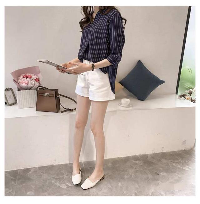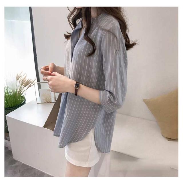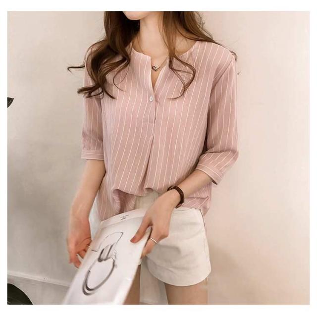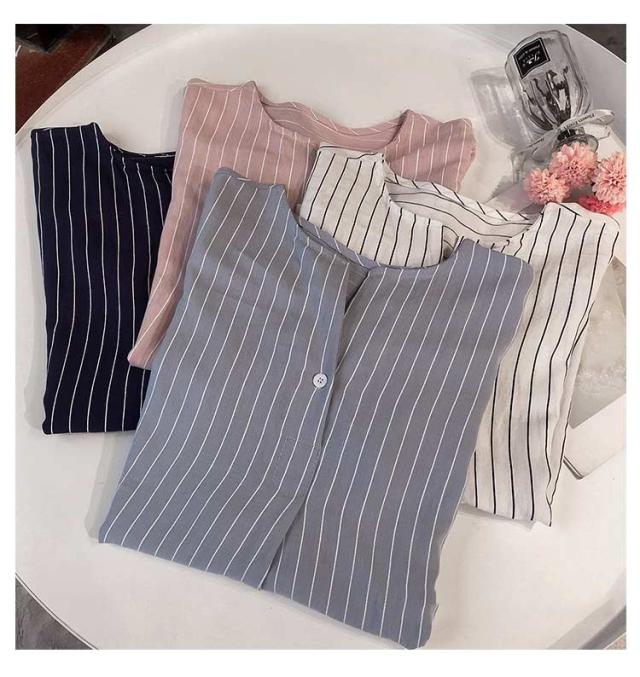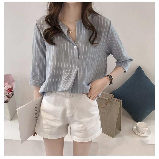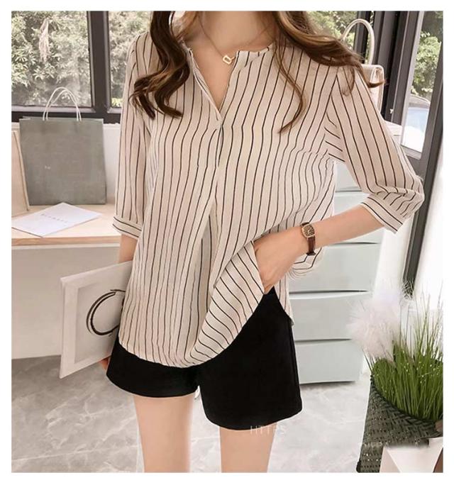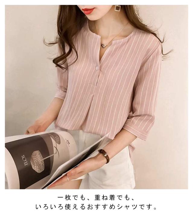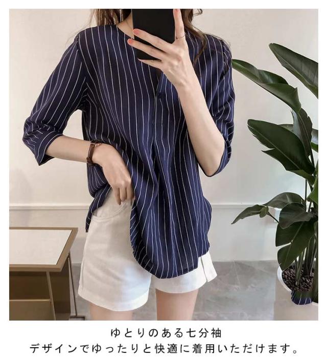 シャツ ストライプシャツ ブラウス 大きいサイズ ブラウス Vネック トップス プルオーバー ノーカラー レディース 大人女性 カジュアル おしゃれ 春夏 通勤 ゆったり 体型カバー 着?せ 夏服