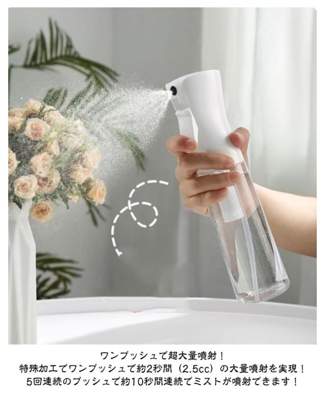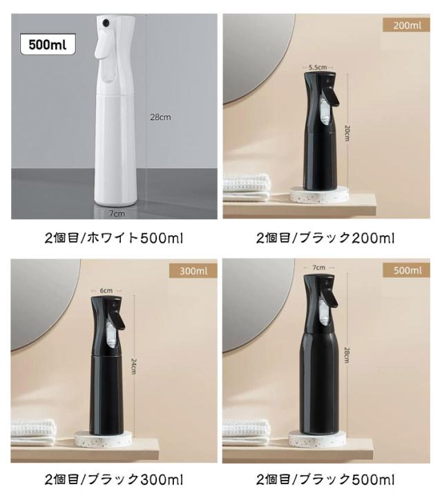 | 超微細ミスト スプレーボトル 500ml/300ml/200ml 3サイズ・4タイプを自由に選べる【2個セット】 ●POINT 1 とにかくミストがキメ細かい! 約30ミクロンの超キメ細かいミストの噴霧を実現! ミストがキメ細かいとメリットたくさん! メリットたくさん!超微細ミスト!! 水やりの場合: 1観葉植物の乾燥を防ぐ 2防虫になる 3葉の汚れを落とす 化粧水の場合: 1顔全体にうるおい成分を浸透 2化粧後の乾燥が気になる肌にも使える 3顔だけでなく全身に使える 4外出先での化粧直しにも使える ●POINT 2 ワンプッシュで超大量噴射! 特殊加工でワンプッシュで約2秒間(2.5cc)の大量噴射を実現! 5回連続のプッシュで約10秒間連続でミストが噴射できます! ●POINT 3 部屋にも馴染むシンプルデザイン 日常のあらゆる場面で使用できるよう、インテリアにも馴染むデザインを採用しました! ●POINT 4 床に水滴が落ちません! 歯切れよく噴射が止まり床に水滴が落ちないので、床を拭く必要もありません! ●POINT 5 アイデア次第で「便利」が広がります! 使用例)水やり、アイロン掛け、アルコールや次亜塩素酸水用のボトル、肌の乾燥対策、室内外の清掃、寝癖直し 360°噴射できます! 横向きはもちろん逆さまでも問題なく噴射できて使い勝手抜群です! | |