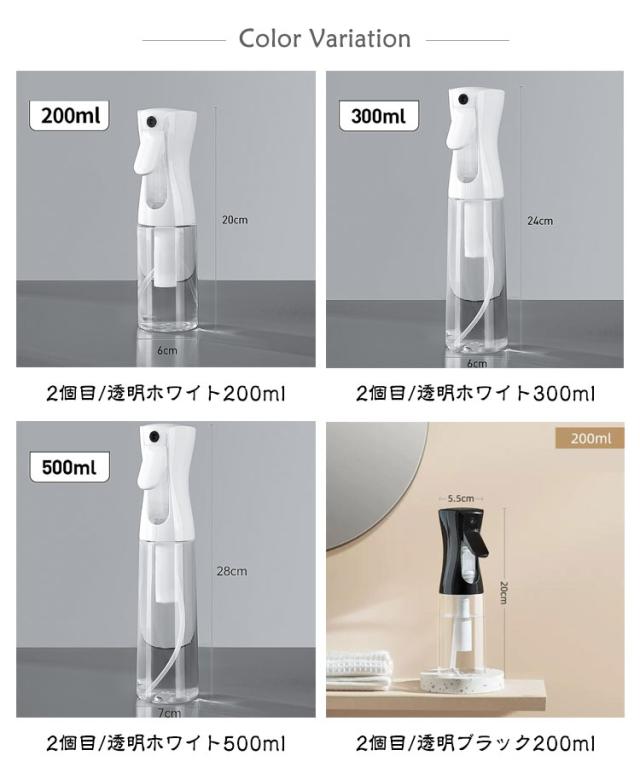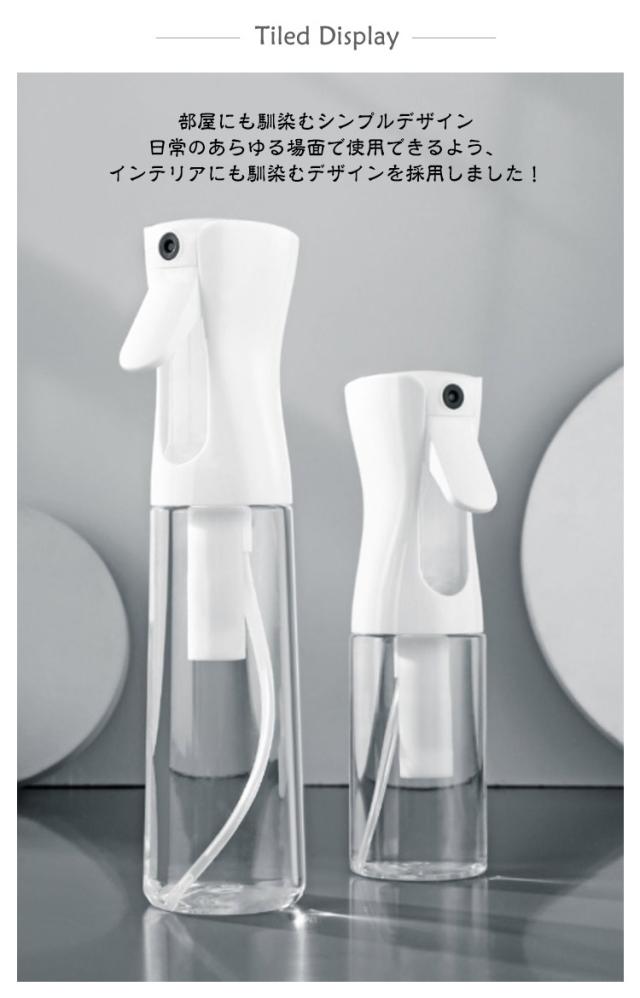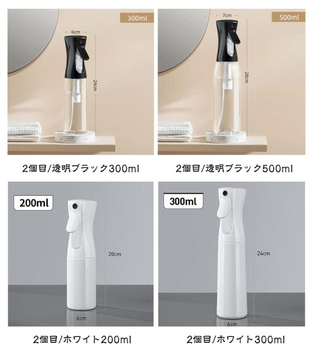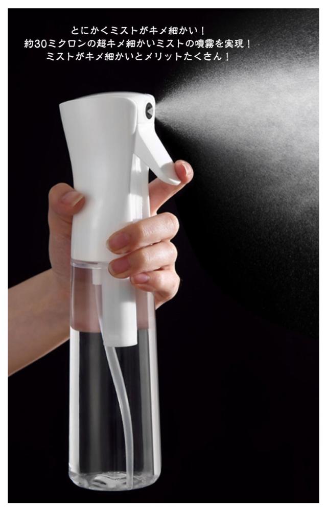 | 超微細ミスト スプレーボトル 500ml/300ml/200ml 3サイズ・4タイプを自由に選べる【2個セット】 ●POINT 1 とにかくミストがキメ細かい! 約30ミクロンの超キメ細かいミストの噴霧を実現! ミストがキメ細かいとメリットたくさん! メリットたくさん!超微細ミスト!! 水やりの場合: 1観葉植物の乾燥を防ぐ 2防虫になる 3葉の汚れを落とす 化粧水の場合: 1顔全体にうるおい成分を浸透 2化粧後の乾燥が気になる肌にも使える 3顔だけでなく全身に使える 4外出先での化粧直しにも使える ●POINT 2 ワンプッシュで超大量噴射! 特殊加工でワンプッシュで約2秒間(2.5cc)の大量噴射を実現! 5回連続のプッシュで約10秒間連続でミストが噴射できます! ●POINT 3 部屋にも馴染むシンプルデザイン 日常のあらゆる場面で使用できるよう、インテリアにも馴染むデザインを採用しました! ●POINT 4 床に水滴が落ちません! 歯切れよく噴射が止まり床に水滴が落ちないので、床を拭く必要もありません! ●POINT 5 アイデア次第で「便利」が広がります! 使用例)水やり、アイロン掛け、アルコールや次亜塩素酸水用のボトル、肌の乾燥対策、室内外の清掃、寝癖直し 360°噴射できます! 横向きはもちろん逆さまでも問題なく噴射できて使い勝手抜群です! | |