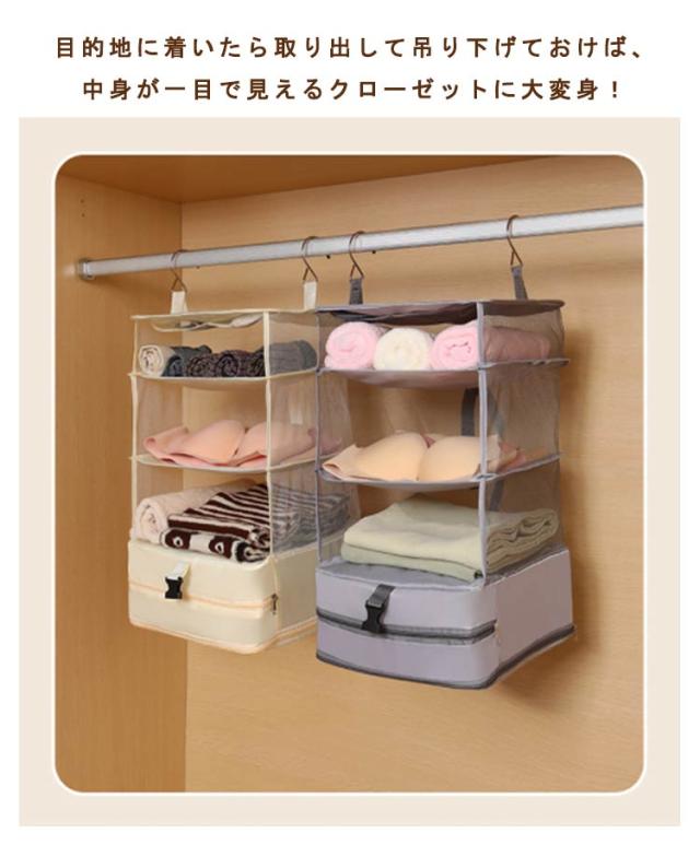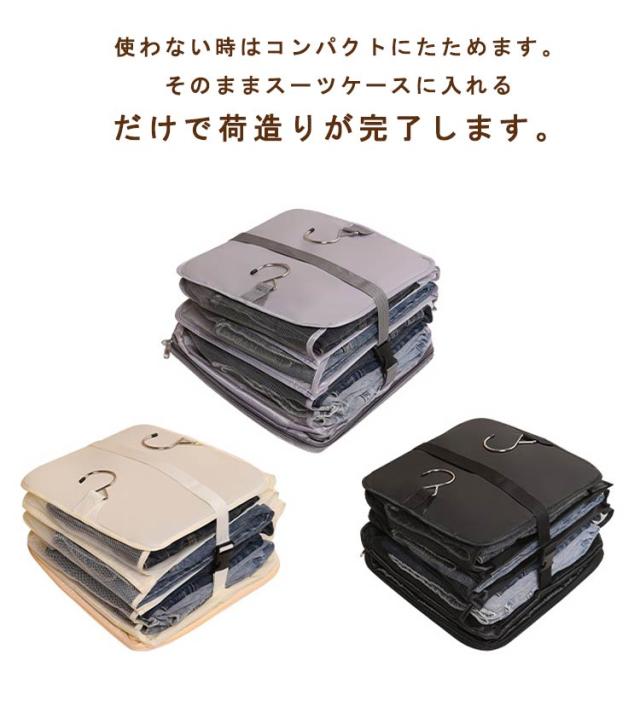 | 旅行先や出張先で大活躍!持ち運べるクローゼット。 中身をいれたままコンパクトに収納!スーツケースの中をすっきり整理。 クローゼットに吊るしてオープン収納としても。吊り下げて使用できるから中身が見やすく取り出しやすい。 サイドには通気性のよいメッシュ素材を使用。吊り下げや圧縮、どちらでも利用可能!圧縮時は収納スペースを50%節約可能 使わない時はコンパクトにたためます。そのままスーツケースに入れるだけで荷造りが完了します。 目的地に着いたら取り出して吊り下げておけば、中身が一目で見えるクローゼットに大変身! | |