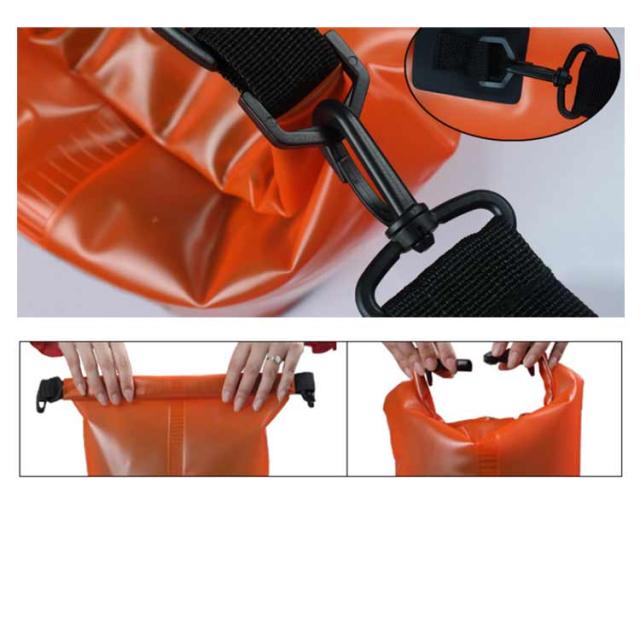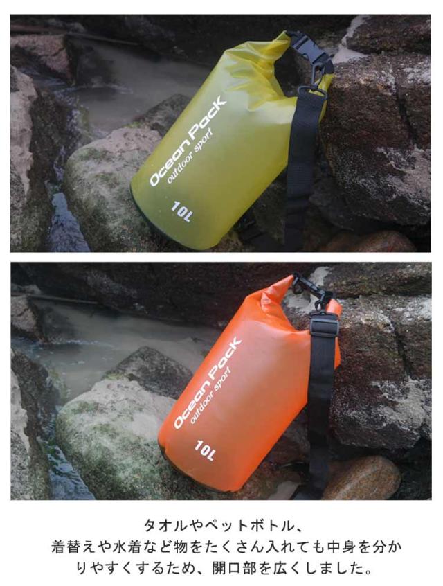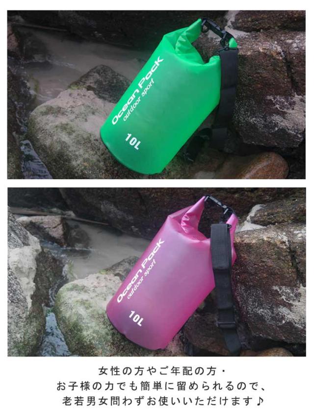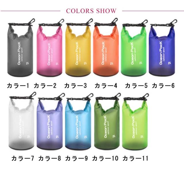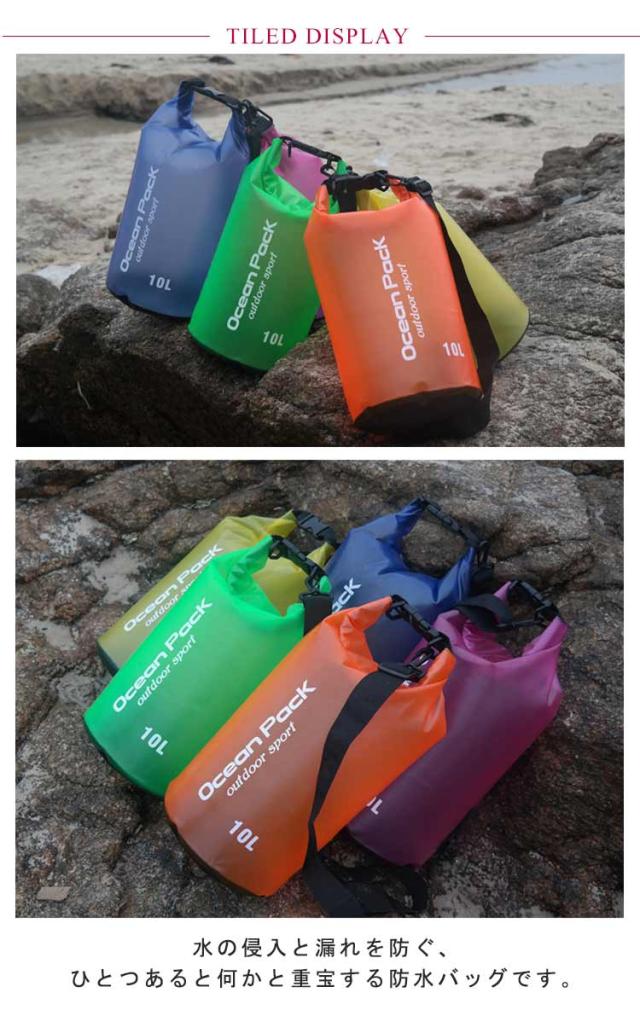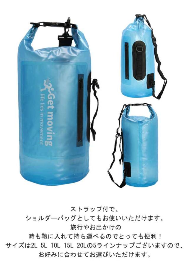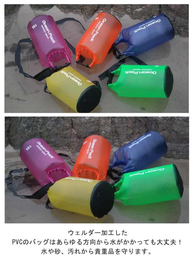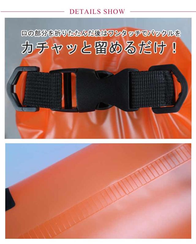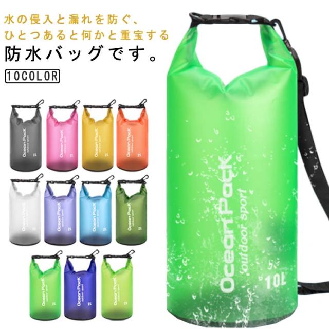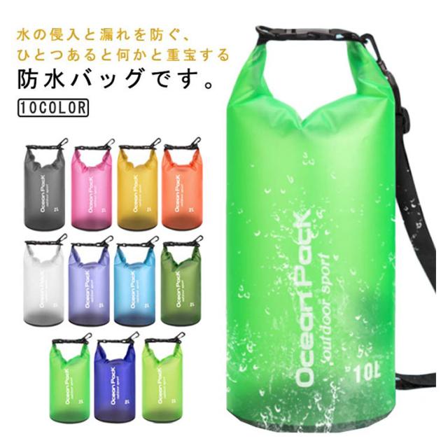 | 水の侵入と漏れを防ぐ、ひとつあると何かと重宝する防水バッグです。 ウェルダー加工したPVCのバッグはあらゆる方向から水がかかっても大丈夫!水や砂、汚れから貴重品を守ります。 タオルやペットボトル、着替えや水着など物をたくさん入れても中身を分かりやすくするため、開口部を広くしました。 口の部分を折りたたんだ後はワンタッチでバックルをカチャッと留めるだけ! 女性の方やご年配の方・お子様の力でも簡単に留められるので、老若男女問わずお使いいただけます♪ ストラップ付で、ショルダーバッグとしてもお使いいただけます。 旅行やお出かけの時も鞄に入れて持ち運べるのでとっても便利! サイズは2L 5L 10L 15L 20Lの5ラインナップございますので、お好みに合わせてお選びいただけます。 | |