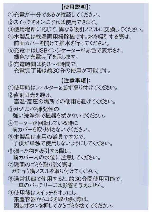 | 家でも車でもどちらでもとっても便利な小型掃除機。 【使用説明】: 1.充電が十分であるか確認してください。 2.スイッチをオンにすれば使用できます。 3.使用場所に応じて、異なる吸引ノズルに交換してください。 4.本製品は乾湿両用掃除機です。水を吸引する際は、前面カバーを開けて排水を行ってください。 5.充電中はUSBインジケーターが赤色で表示され、緑色で充電完了を示します。 6.充電時間は約3〜4時間で、充電完了後は約30分の使用が可能です。 【注意事項】: 1.使用時はフィルターを必ず取り付けてください。 2直射日光を避け、高温・高圧の場所での使用を避けてください。 3.ガソリンや揮発性の強い洗浄剤で機器を拭かないでください。 4.モーターが回転している時に前カバーを取り外さないでください。 5.本製品は車用の道具ですので、子供が単独で使用しないようにしてください。 6.湿った物を吸引する際は、前カバー内の水位に注意してください。 7.隙間のゴミを取り除く際は、ガチョウ嘴ノズルを取り付けてください。 8.通常状態で使用すると、約30分間使用可能で、車のバッテリーには影響を与えません。 9.使用後はスイッチをオフにし、集塵容器からゴミを取り除く際は、固定ボタンを押してからゴミを捨ててください。 | |